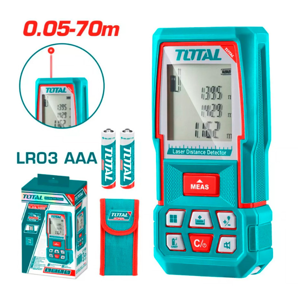 TOTAL TMT57026 635Նմ տարածության լազերային չափիչը հագեցած է հետևյալ գործառույթներով՝ մեկանգամյա չափում, անընդհատաբար չափում, անուղղակի չափում, տարածության չափում, ծավալի չափում, մեկանգամյա չափում՝ ըստ Պյութագորասի թեորեմի, կրկնակի պյութագորասյան գումարած, կրկնակի պյութագորասյան հանած, տարածության կրկնակի չափում։ Չափման միջակայքը՝ 0.05-70մ։ Չափիչն աշխատում է մարտկոցով։ Փաթեթում՝ 2 հատ 1.5Վ AAA մարտկոց։