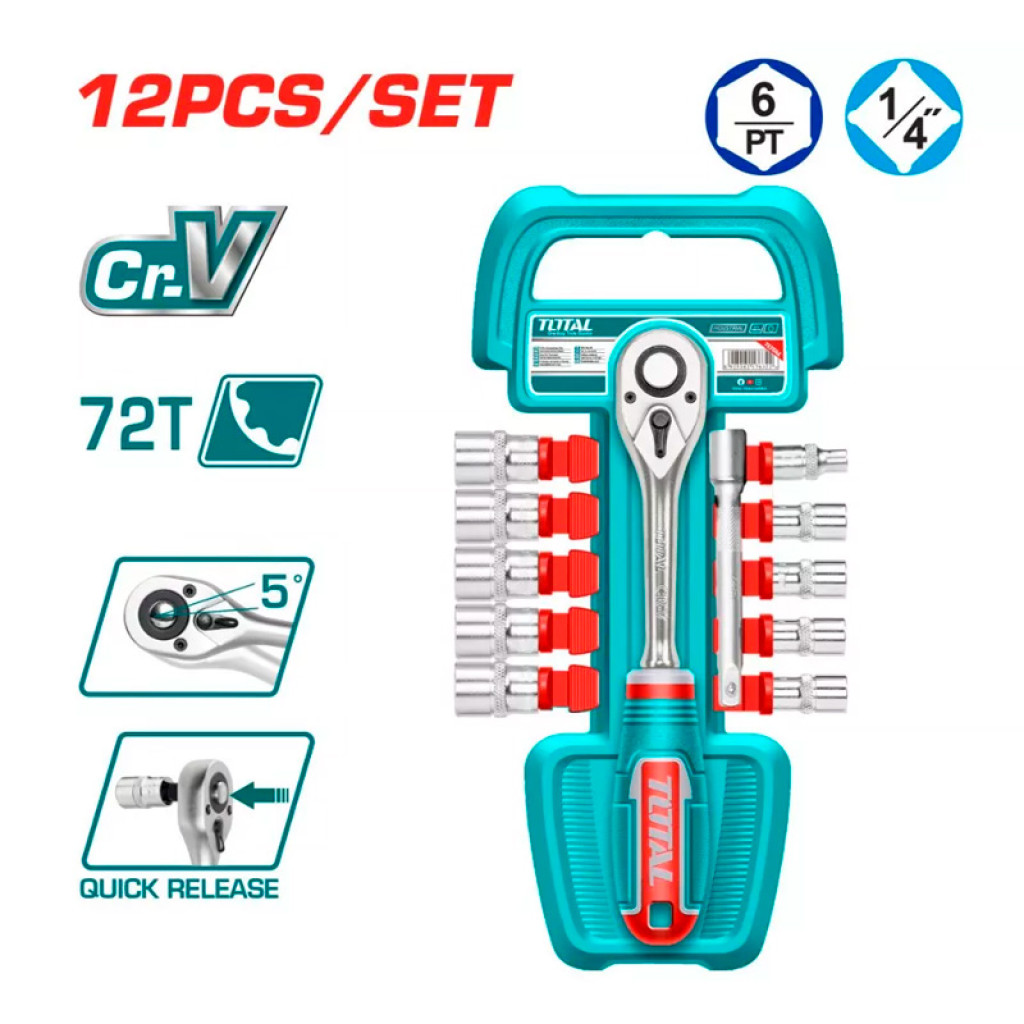 ԸՆԴԱՄԵՆԸ 12 հատ 1/4 "վարդակների հավաքածու TOTAL THT14114126 : Պարուրաձև միացումներով մոնտաժման , ապամոնտաժման , վերանորոգման աշխատանքների գործիքների ամբողջություն : Տեղադրման չափը ՝ 1/4" : Ռակետկա մեխանիզմով բռնակը հագեցած է հատուկ կոճակով , որի շնորհիվ գլուխների փոփոխությունն ավելի արագ է կատարվում : Աշխատանքային մասերը պատրաստված են քրոմապատ քրոմ-վանադիումային պողպատից ինչն էլ գործիքին տալիս է ուժ և երկար աշխատանքային սպասարկում : Բռնակը հարմար է օգտագործման համար և չի սահում : Առկա կախիչը թույլ է տալիս գործիքը կոկիկ պահել :