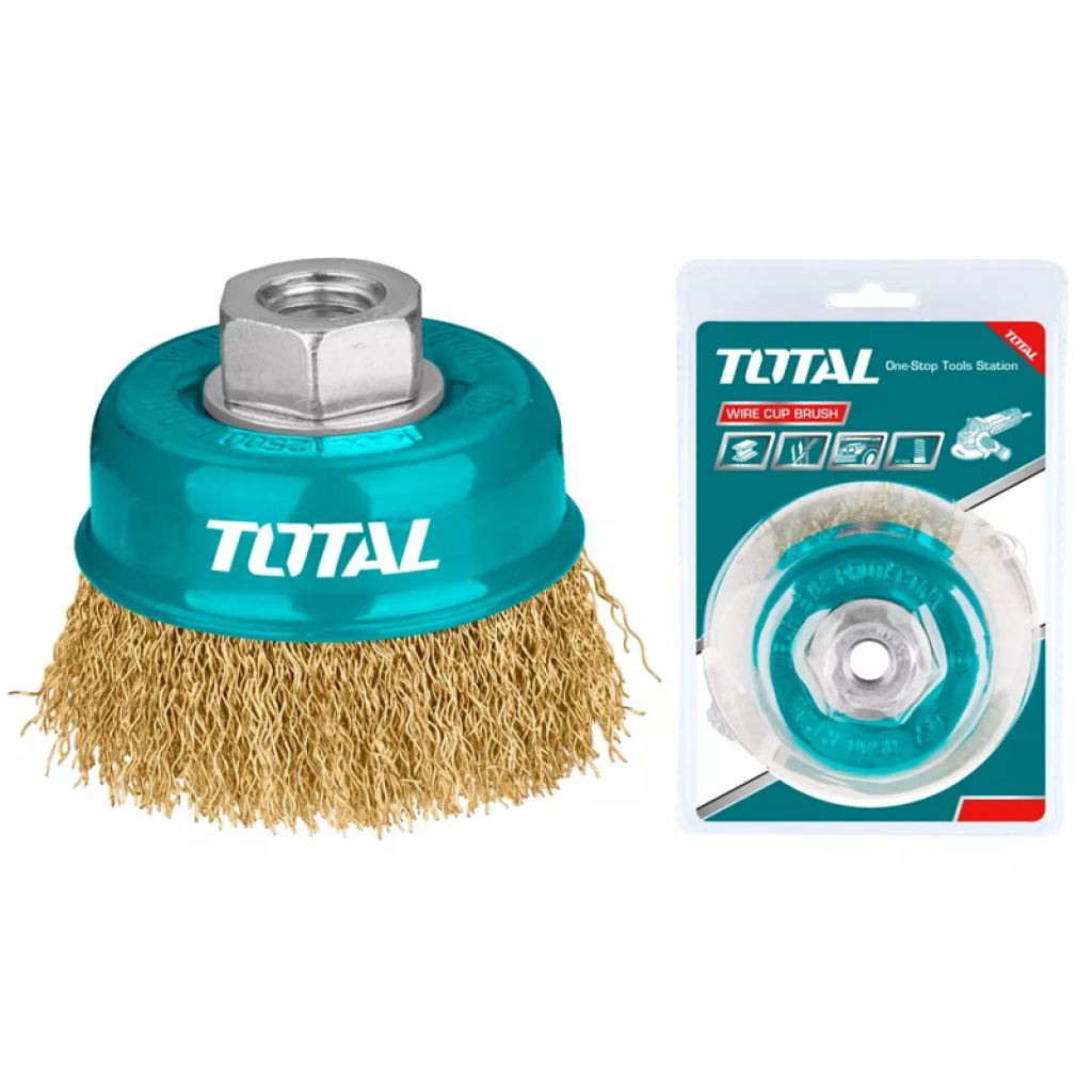 TOTAL TAC31061 - խոզանակը փոխարինող տարր է անկյունային հղկիչների համար : Այն օգտագործվում է լաքից , ներկից և ժանգից տարբեր մակերեսներ և ապրանքներ մաքրելու համար : Աշխատանքային մասը բաղկացած է արույրով ծածկված պողպատե մետաղալարից :