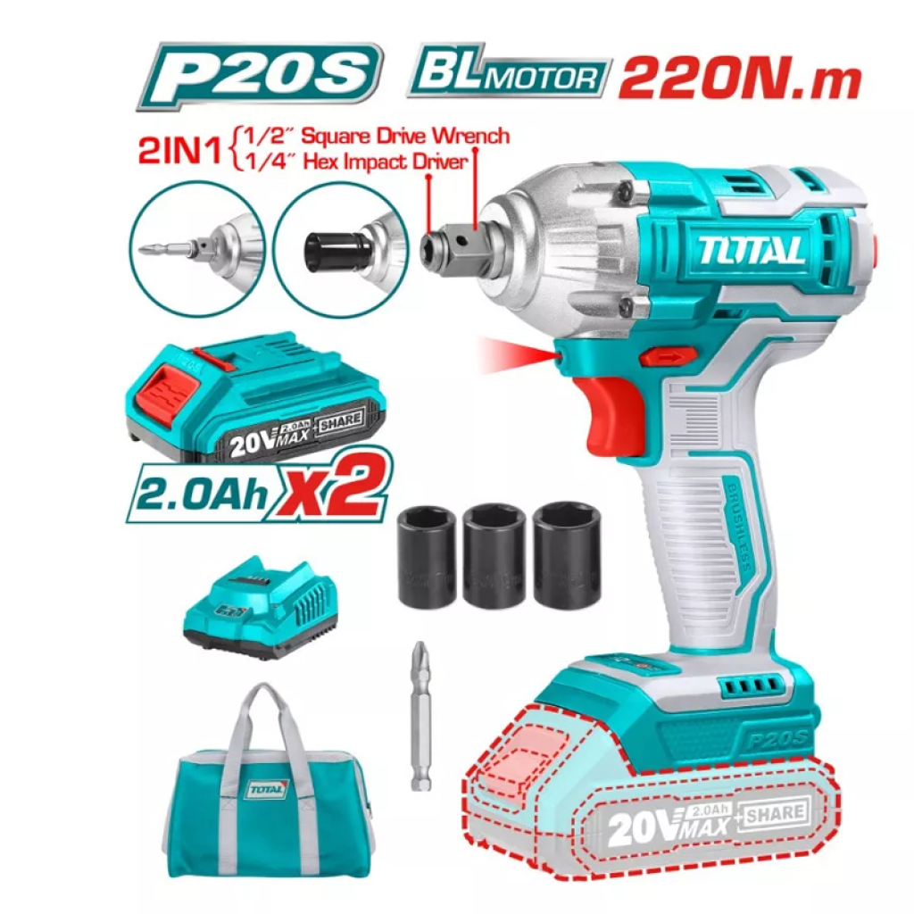 Հարվածային գայկավյորտ մարտկոցային 2-ը 1-ում 20Վ 220Նմ (2 մարտկոցով, լիցքավորիչով) TOTAL TIWLI20208 (ԿՈԴ 13819)