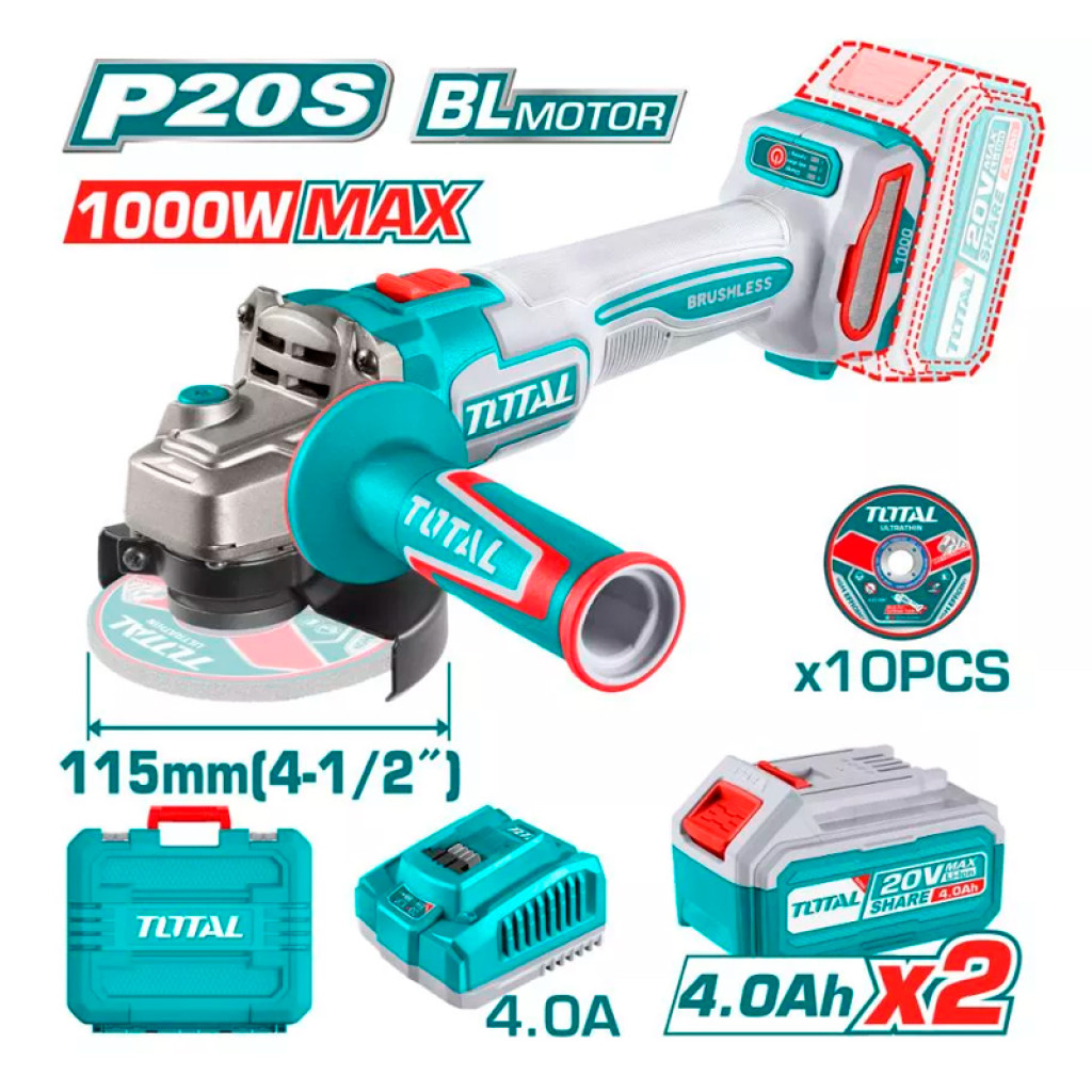 Անկյունային հղկող մեքենա մարտկոցային (2 մարտկոցով, լիցքավորիչով, 10 սկավառակ) TOTAL TAGLI271532 (ԿՈԴ 15505)