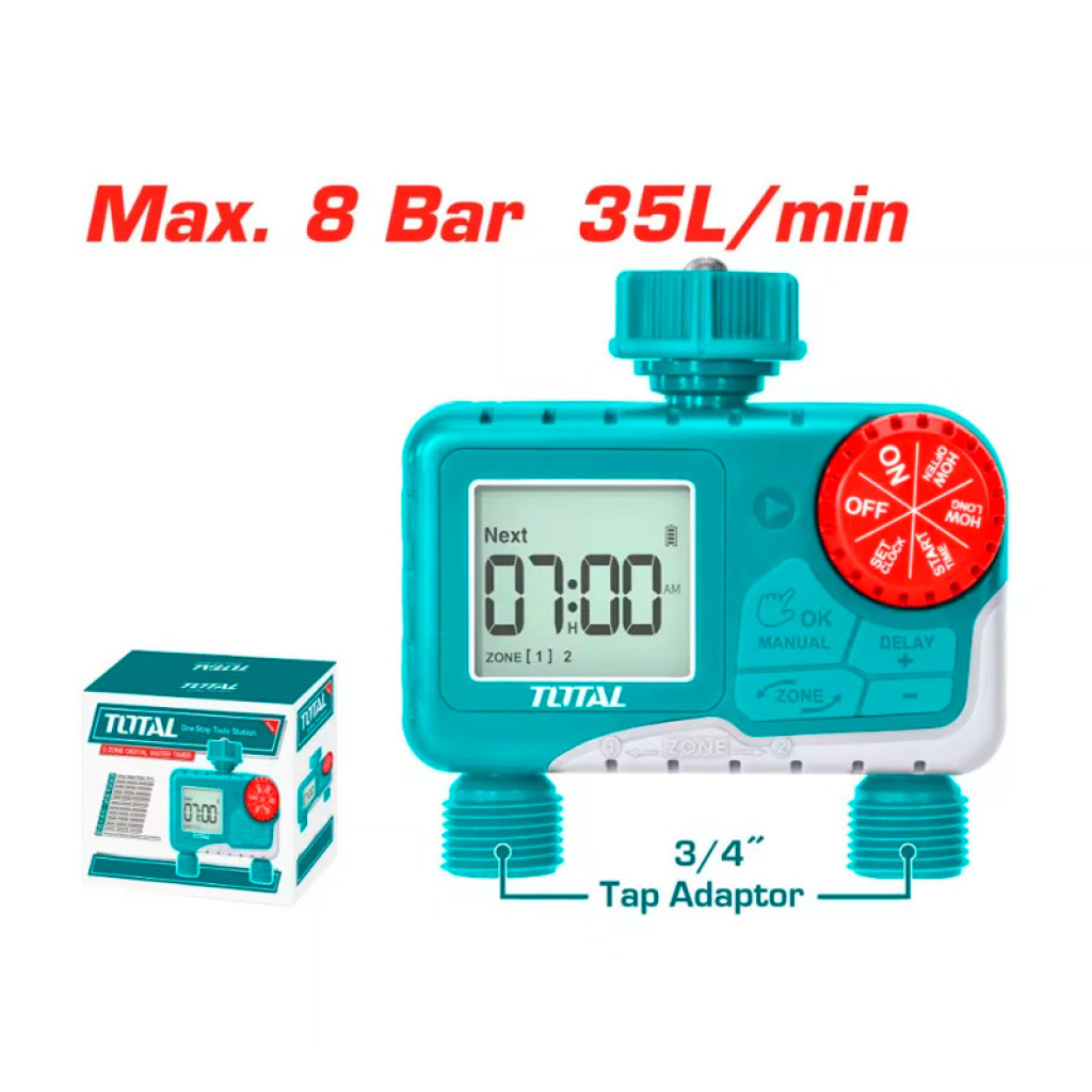 Ջրի երկգոտի թվային ժամաչափը կարող է ծրագրել ջրի հոսքը երկու առանձին գոտիներում՝ ապահովելով մինչև 8 բար ճնշում և 35 լ/ր արտադրողականություն։ Հարմար է այգիների և բանջարանոցների ոռոգման համար։ Աշխատում է 2 հատ AA մարտկոցով (ներառված չէ փաթեթում)։ Յուրաքանչյուր գոտու համար կարող է դրվել ոռոգման առանձին ծրագիր։ Առկա է 24-ժամյա անձրևի գործառույթ։ Սարքը հագեցած է նաև ոռոգման ծրագրավորման մասին հիշեցման գործառույթով։ Հեշտորեն կարելի է չեղարկել ծրագրերը։