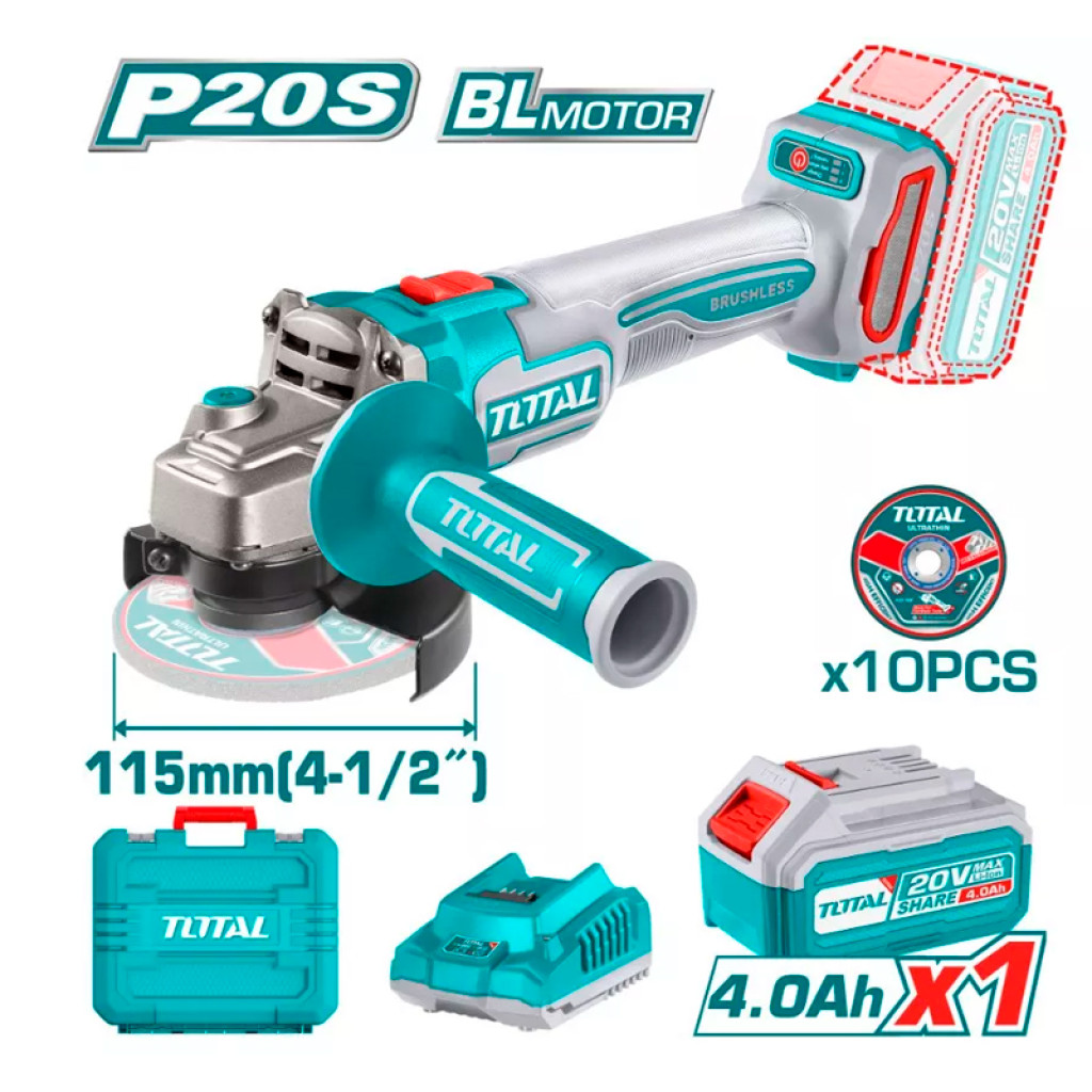 Անկյունային հղկող մեքենա մարտկոցային 20Վ 115մմ (10 սկավառակ) TOTAL TAGLI211541 (ԿՈԴ 15512)