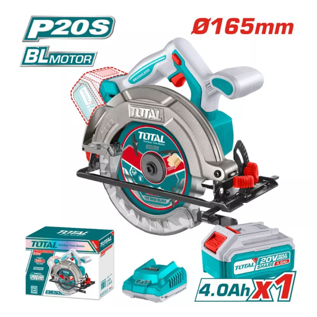 TOTAL TSLI16521 մարտկոցային սղոցը հարմար է մետաղի, փայտի ուղիղ և անկյունային կտրման համար։ Փաթեթում՝ 1 հատ 165մմ սկավառակ, 1 հատ 4․0Աժ մարտկոց (TFBLI20021), 1 հատ լիցքավորիչ (TFCLI2001):