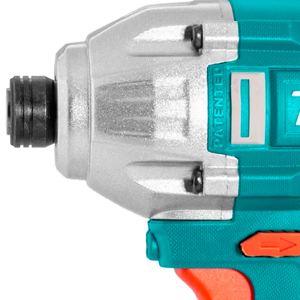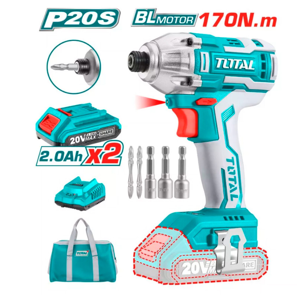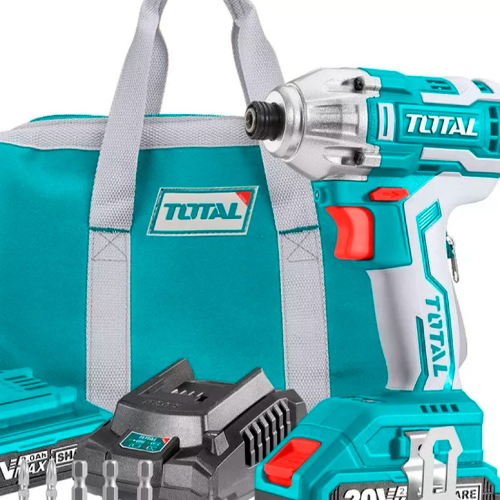TOTAL TIRLI2002 պտուտակադարձիչը սնուցվում է 2 Աժ լիթիում-իոնային մարտկոցից՝ դրանով իսկ ապահովվելով առավելագույն ինքնավարություն, երբ օգտագործվում է ցանցից հեռու: Այս մոդելի հզորությունը 20 Վոլտ է ՝ առանց բեռնվածքի 0-ից մինչև 2400 պ/ր արագություն, մինչդեռ առավելագույն մոմենտը՝ 170 Նմ: Ներկառուցված LED-լույսը և լիցքավորման մակարդակի ցուցիչը հեշտացնում են այս գործիքի աշխատանքը: Հավաքածուն ներառում է լիցքավորիչ, 2 բիթ 50 մմ(Cr-V): Պտտման կոճակը, հակադարձ անջատիչը և արգելակման կոճակը տեղակայված են ձեռքին հարմար տեղում: