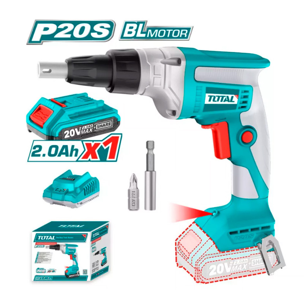 TOTAL TDSLI204200 գիպսաստվարաթղթի պտուտակահանը պրակտիկ գործիք է։ Սարքի պտտման առավելագույն ուժը 30 նմ է։ Փաթեթում ներառված են՝ 1 հատ 2.0 Աժ վերալիցքավորվող մարտկոց, 1 հատ լիցքավորիչ, 1 հատ բիթ բռնիչ։