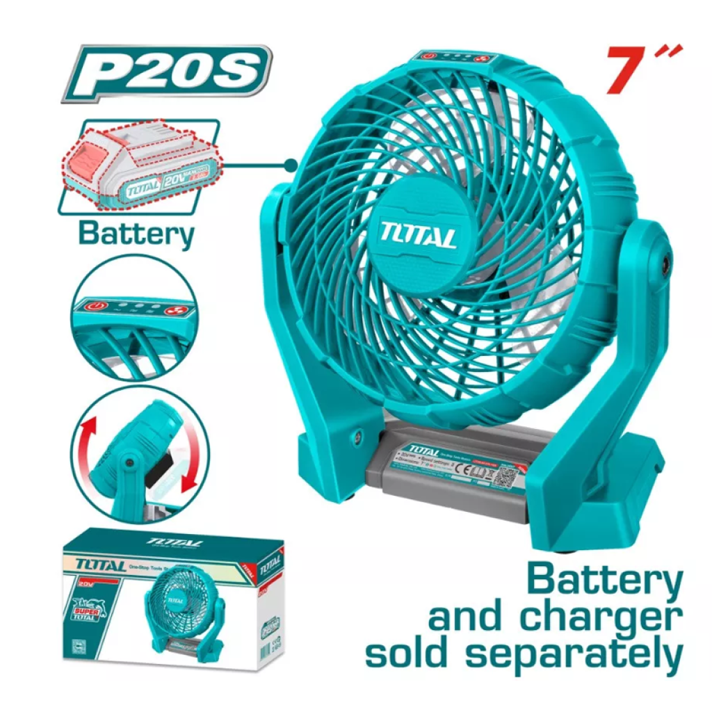 Օդափոխիչն աշխատում է P20S մարտկոցով, ինչի շնորհիվ այն հնարավոր է օգտագործել նաև առանց էլեկտրականության պայմաններում։ Սարքի դիրքը կարգավորվող է։ Մարտկոցն ու լիցքավորիչը վաճառվում են առանձին։ Չափը՝ 180մմ։Օդափոխիչ մարտկոցային 20Վ TOTAL TFALI2007 (ԿՈԴ 14003)