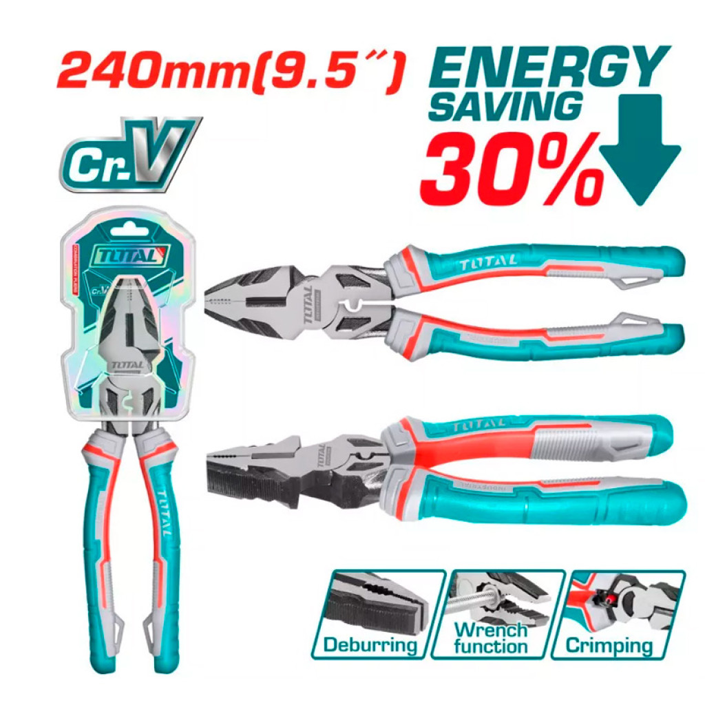 Համակցված տափակաբերան աքցան 240 մմ TOTAL THT210906S - ը օգտագործվում է փականագործի աշխատանքներում `տարբեր մասեր բռնելու, պահելու, ոլորելու համար, օրինակ ` տարբեր լարերի : Ապրանքը բնութագրվում է բարձր ամրությամբ : Տափակաբերան աքցանը պատրաստված է քրոմ վանադիումի պողպատից և հագեցած է երկու կտոր բռնակներով : Դրա շնորհիվ նա դիմակայում է կոռոզիային և չի դեֆորմացվում, հարմար տեղավորվում է ձեռքում և չի սայթաքում :
