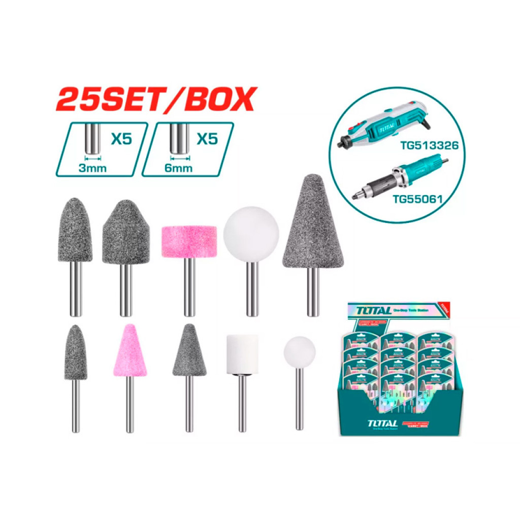 Փաթեթի բովանդակություն | 5 հատ հղկման սրունքներ, 1 հատ գլանաձև 19*26 մմ, 1 հատ փամփուշտի տեսակի 14*25 մմ, 1 հատ կոն 25*38 մմ ,1 հատ T-տիպ 25*13մմ, 1 հատ կլոր 23*24 մմ, 5 հատ հղկման սալիկներ, 1 հատ փամփուշտի տեսակ 10*18 մմ, 1 հատ կոն 13*21 մմ, 1 հատ կոն 13*21 մմ, 1 հատ T-տիպ 12*13մմ, 1 հատ կլոր 12*12 մմ |
