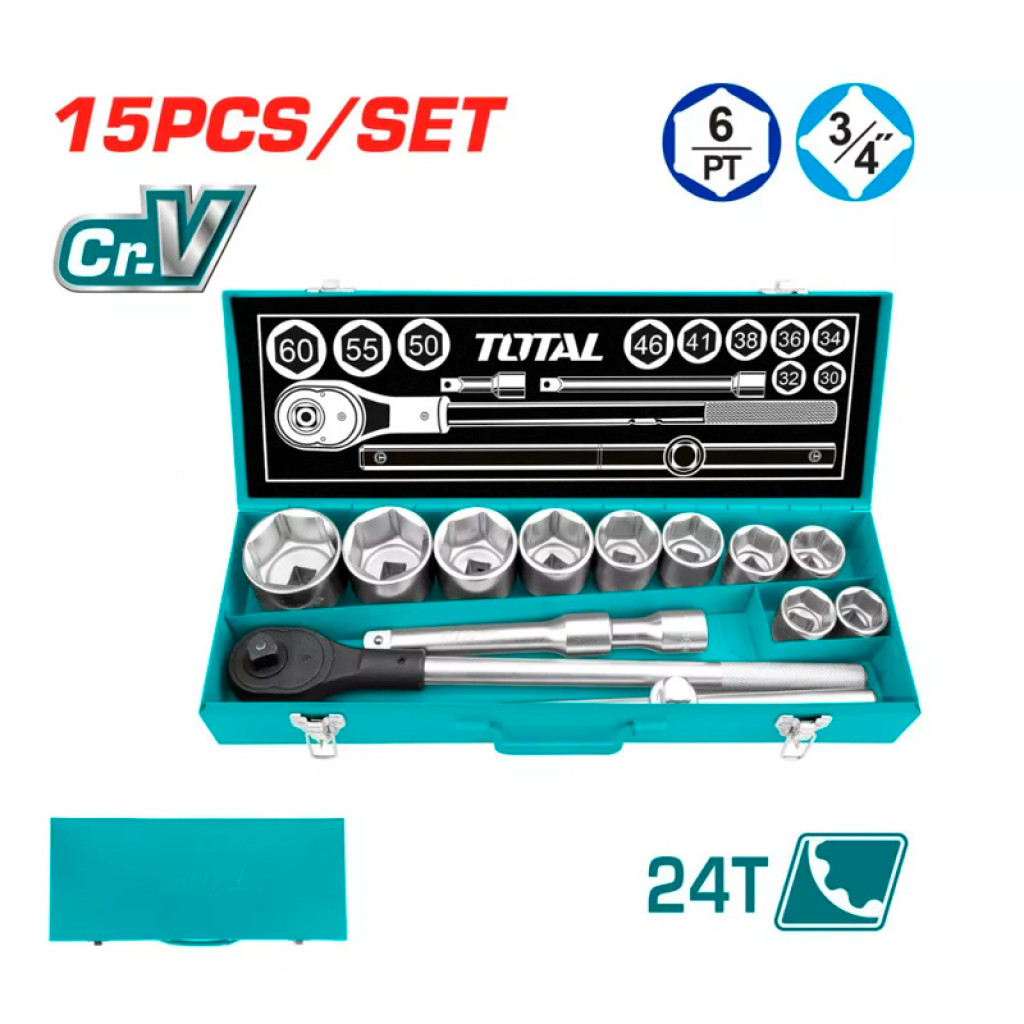 TOTAL 3/4 15 հատ THT341151 - օգտագործվում է մեքենաների սպասարկման համար , ինչպես ավտոտեխսպասարկումներում , այնպես էլ կենցաղային պայմաններում : Հավաքածուի մեջ ներառված պարագաները նախատեսված են 3/4 " միացման չափի համար : Գործիքների և հավաքածուի աշխատանքային մասերը պատրաստված են կարծրացված քրոմ - վանադիումի պողպատից , որը դիմացկուն է կոռոզիային և դեֆորմացիային : Հուսալի և ամուր պատյան հեշտացնում է փոխադրումը և ապահովվում գործիքների պահպանումը :