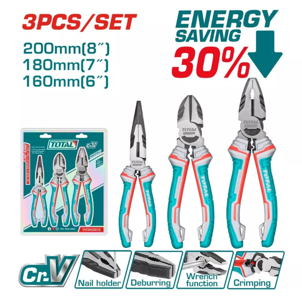 TOTAL THT2K0301S- ը հարմար է վերանորոգման և տեղադրման աշխատանքների լայն շրջանակի համար : Գործիքների աշխատանքային մասերը պատրաստված են բարձր ամրության և կոռոզիային դիմակայող քրոմ վանադիումի պողպատից , ունեն օքսիդացված և փայլեցված ծածկույթ : Բռնակները պատրաստված են ջերմապլաստիկ կաուչուկից , ունեն էրգոնոմիկ ձև՝ հարմարավետ օգտագործման համար :