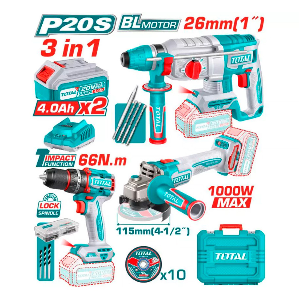 Փաթեթի բովանդակություն | 1 հատ կոմպակտ անխոզանակ անլար հարվածային պտուտակադառձիչ (TIDLI206681) 1 հատ անլար անկյունային հղկող մեքենա (TAGLI27153) 1 հատ անլար հորատիչ (TRHLI20268) 47 հատ պարագաներ 3 հատ քարե հորատման գլխիկներ 1 հավաքածու հղկող մետաղ կտրող սկավառակ (10 հատ) 3 հատ հորատման գլխիկներ 1 հատ սղոց 2 հատ 4.0 Աժ մարտկոց (TFBLI20021) 1 հատ լիցքավորիչ (TFCLI2001) |