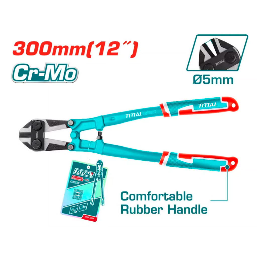 Պտուտակի կտրիչ 300 մմ TOTAL THT113126 - ը օգտագործվում է պտուտակներ, ձողեր, կցամասեր, կտրելու համար : Ապրանքի աշխատանքային մասը պատրաստված է քրոմ-վանադիումային պողպատից, որի շնորհիվ այն դիմակայում է դեֆորմացումին և կոռոզիային : Բռնակները պատրաստված են պոլիմերային նյութերից ` հարմարավետ աշխատանքի և չսայթաքելու համար : Պտուտակի կտրիչի երկարությունը՝ 300 մմ :