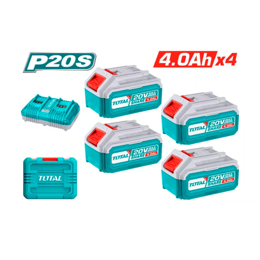 Հավաքածուի մեջ առկա է 4 հատ լիթիում-իոնային մարտկոց (TFBLI20021)։ Յուրաքանչյուր մարտկոցի հզորությունը՝ 4․0Աժ։ Մարտկոցի լարումը՝ 20Վ։ Մարտկոցները հարմար են TOTAL ապրանքանիշի P20S չափանիշով ստեղծված բոլոր գործիքներին։ Առկա է լիցքավորման մակարդակի ներկառուցված LED ցուցիչ։ Փաթեթում ներառված է նաև լիցքավորիչը (TCLI2034), որը նախատեսված է միաժամանակ 2 մարտկոցի լիցքավորման համար։