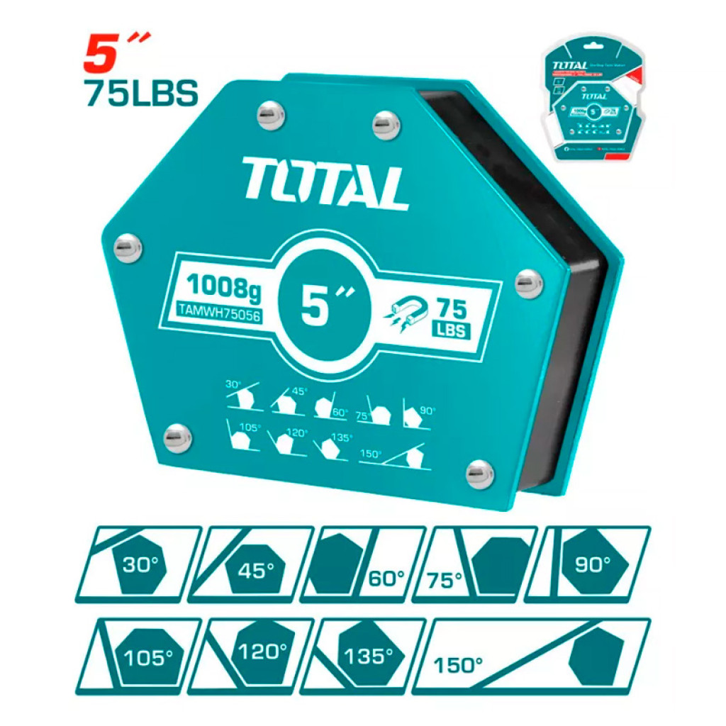Հզոր մագնիսական եռակցման անկյուններ , վահանակների , խողովակների կամ այլ եռակցման մասերի անկյուն : Թույլ է տալիս անկյունների ճշգրիտ հավասարեցում պողպատե կոնստրուկցիաների եռակցման , տեղադրման գործընթացում : Մագնիսական եռակցիչը եռակցողի երկրորդ ձեռքն է : Այլևս օգնություն խնդրելու կարիք չի լինի ։ Մագնիսական եռակցման հարմարանքի շնորհիվ ամբողջ գործընթացը կարող է իրականացվել մեկ աշխատողի կողմից , ինչը մեծապես հեշտացնում է անհրաժեշտ կառուցվածքի արտադրման գործընթացը :Եռակցման մագնիս 6 անկյուն 5'' TOTAL TAMWH75056 (ԿՈԴ 16135)