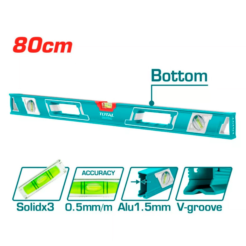 Ալյումինե կոնստրուկցիայի մակարդակի 800 մմ TOTAL TMT28086 - ը օգտագործվում է շինարարության և հարդարման աշխատանքներում ` մակերեսի հարթությունը որոշելու համար : Գործիքը հագեցած է երկու աչքով : Ալյումինե պատյանը տարբերվում է դիմացկունությամբ և մաշվածության նկատմամբ կայունությամբ :