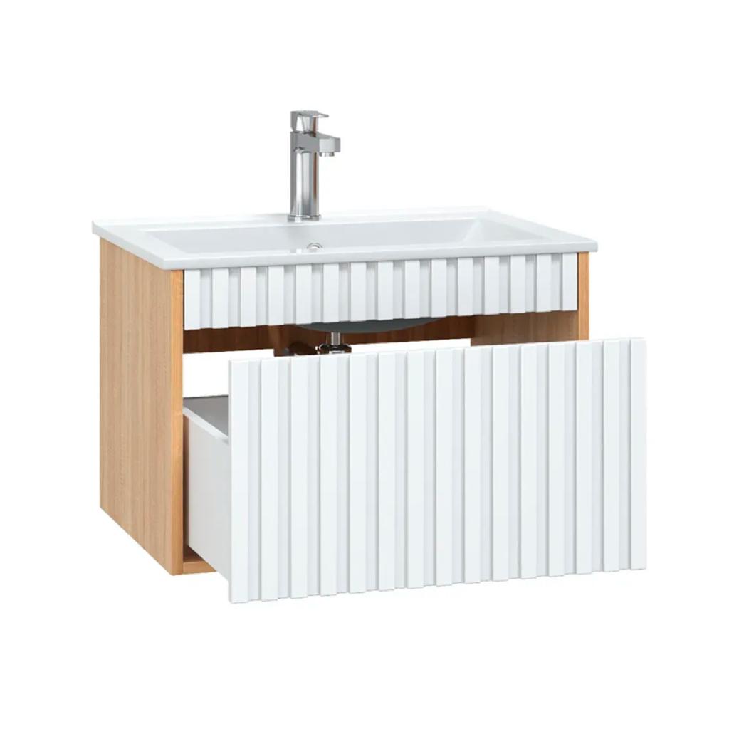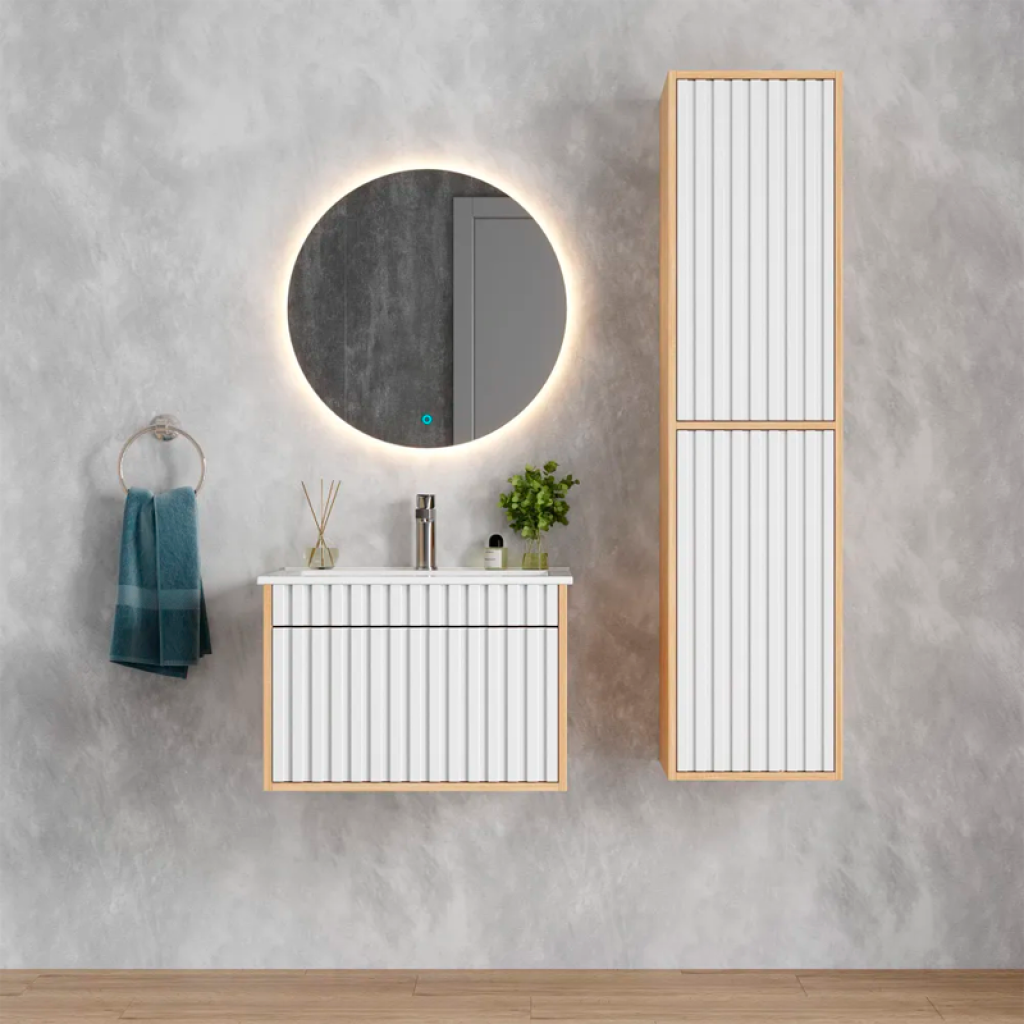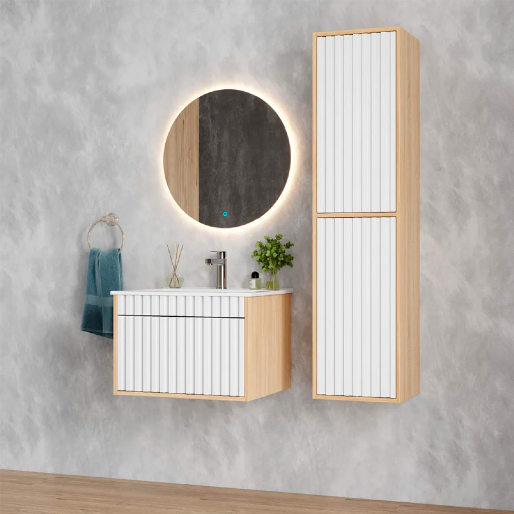 Սպիտակ մատ մակերեսով ռելիեֆային ճակատը SoftTouch ծածկույթով և կաղնու երանգի շքեղ կառուցվածքը ընդգծում են նուրբ ճաշակը և լոգասենյակը դարձնում ավելի ոճային։