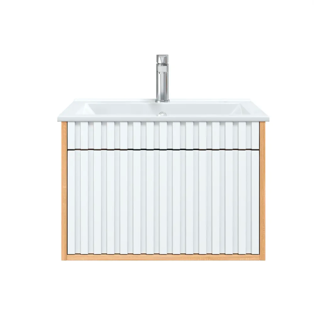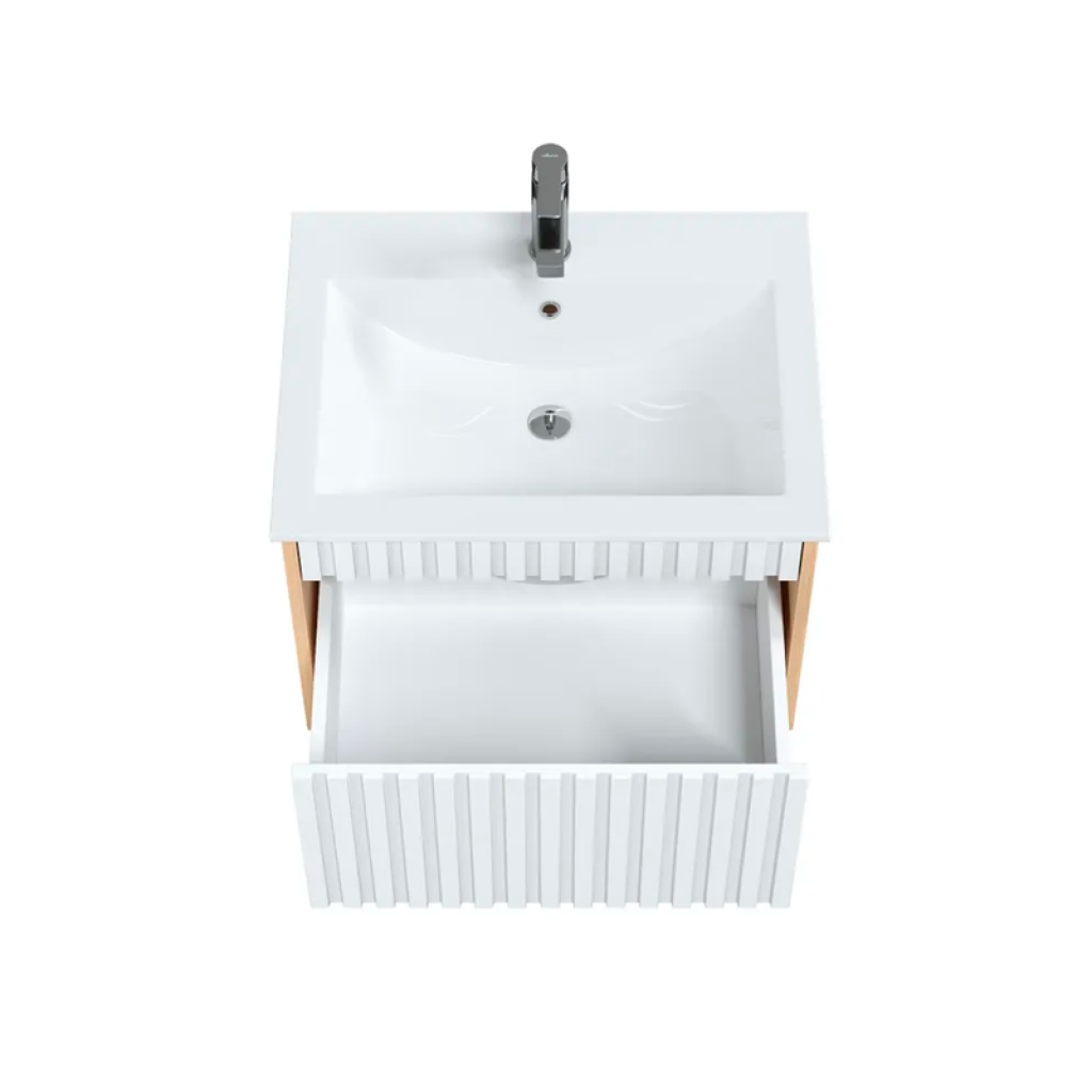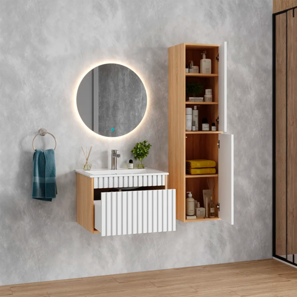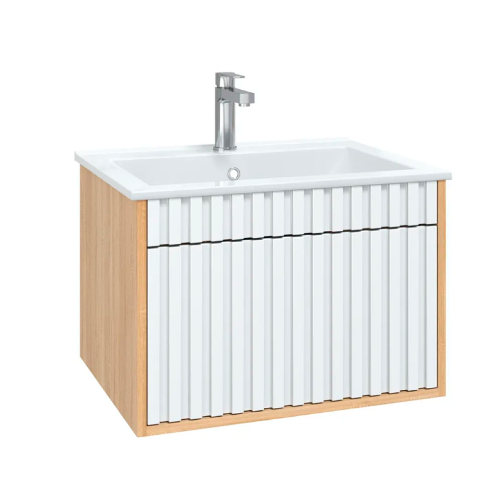 Սպիտակ մատ մակերեսով ռելիեֆային ճակատը SoftTouch ծածկույթով և կաղնու երանգի շքեղ կառուցվածքը ընդգծում են նուրբ ճաշակը և լոգասենյակը դարձնում ավելի ոճային։