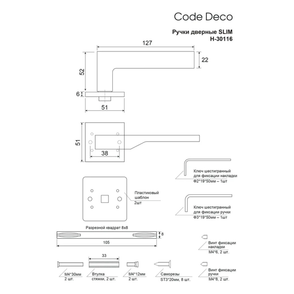 Code Deco Slim քառակուսի հիմքով բռնակը համատեղելի է 0-55° թեքման անկյամբ փականների հետ։ Բռնակները հարմար են 30-ից մինչև 60 մմ հաստությամբ դռների համար։ Տվյալ մոդելի բռնակը անցնում է եռակի որակի վերահսկողություն։ Բռնակը կարող է լրացուցիչ հավաքվել WC ֆիքսատորով կամ գլանային մեխանիզմի ներդիրով։