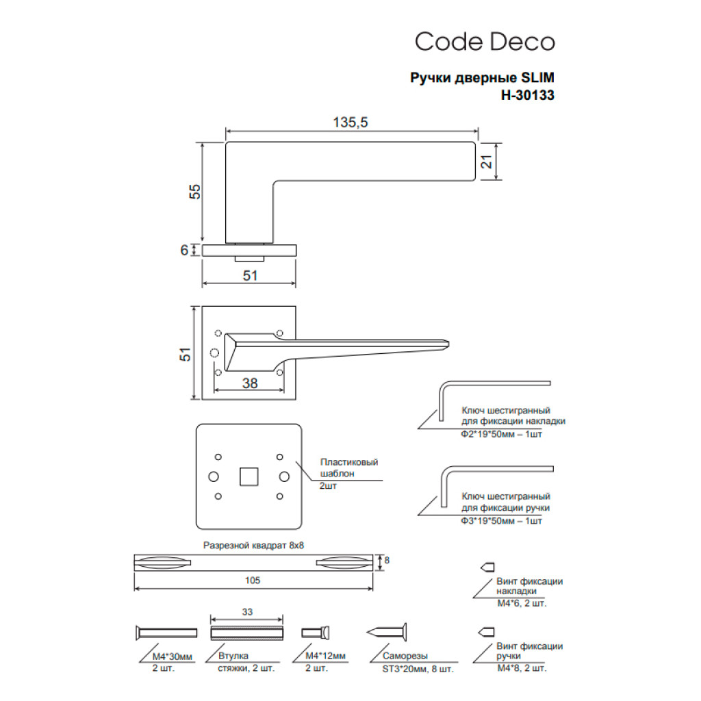 Code Deco Slim քառակուսի հիմքով բռնակը համատեղելի է 0-55° թեքման անկյամբ փականների հետ։ Բռնակները հարմար են 35-ից մինչև 60 մմ հաստությամբ դռների համար։ Տվյալ մոդելի բռնակը անցնում է եռակի որակի վերահսկողություն։ Բռնակը կարող է լրացուցիչ հավաքվել WC ֆիքսատորով կամ գլանային մեխանիզմի ներդիրով։