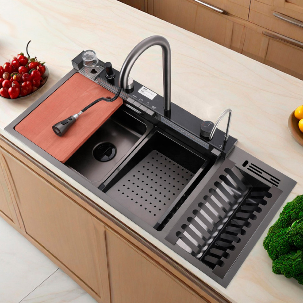 Լվացարան, ծորակ 2 հատ, սիֆոն, չժանգոտվող 2 տարբեր տարաներ, փայտից տախտակ, դիսպենսեր, բաժակ լվանալու սարք