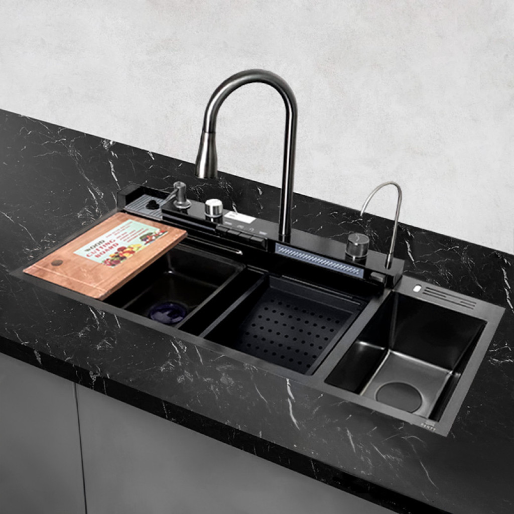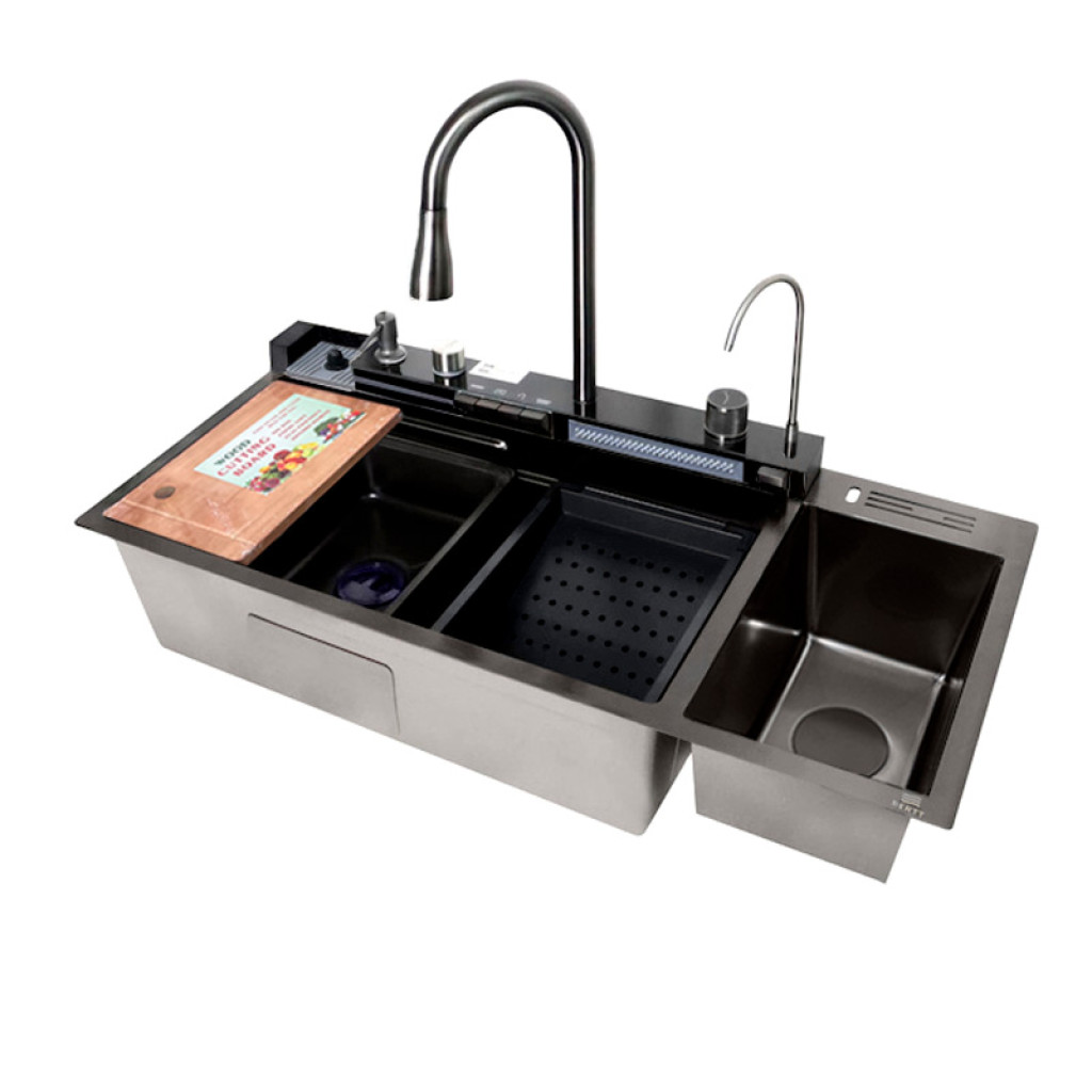 Փաթեթի բովանդակությունը | Լվացարան, ծորակ 2 հատ, սիֆոն, չժանգոտվող 2 տարբեր տարաներ, փայտից տախտակ, դիսպենսեր, բաժակ լվանալու սարք |