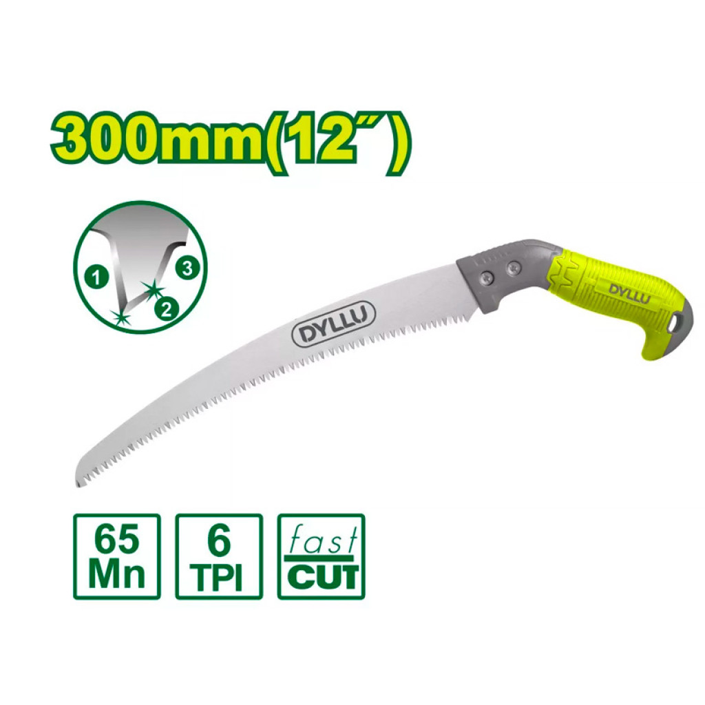 DYLLU DTHW7G12 ձեռքի սղոցը բարձր ճշգրտությամբ հղկված ատամների շնորհիվ արագ է կտրում։ Հարմար է այգիներում, պուրակներում ծառերի ճյուղերի էտման համար։ Երկարությունը՝ 300 մմ։