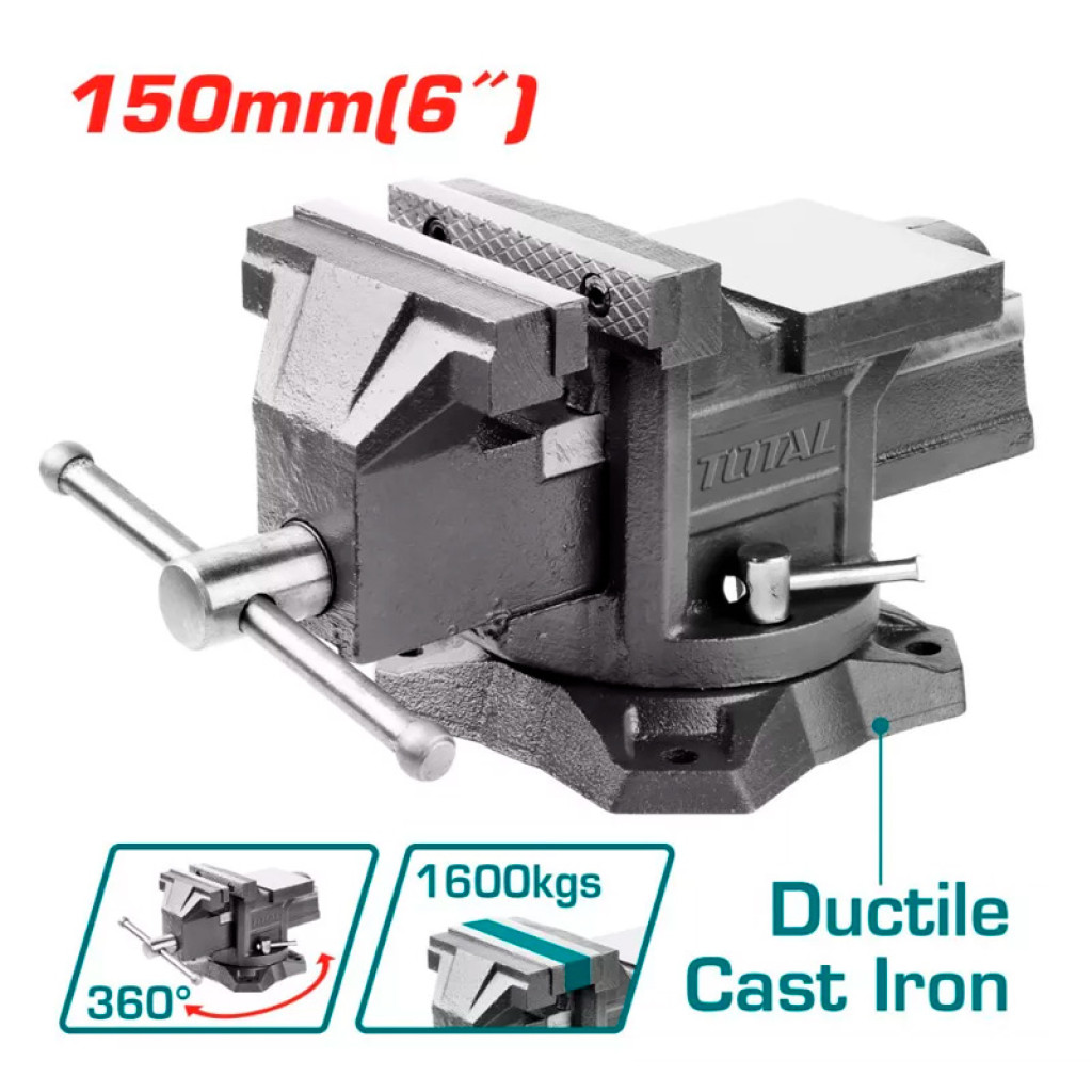 TOTAL THT6166 Փականագործական ամրակ զնդանով - օգտագործվում է փոքր կտորներ ամրացնելու համար : Օգտագործման դյուրինության համար մոդելն ունի առանցքային ֆունկցիա : Մարմինը պատրաստված է բարձր ամրության չուգունից : Լայն զնդանը թույլ է տալիս մուրճով աշխատել : Դաջված պողպատե ծնոտները ապահովվում են մասերի անվտանգ սեղմում : Ամրակը տեղադրվում է աշխատանքային նստարանին (դազգահին) ` մոնտաժային անցքերով :
