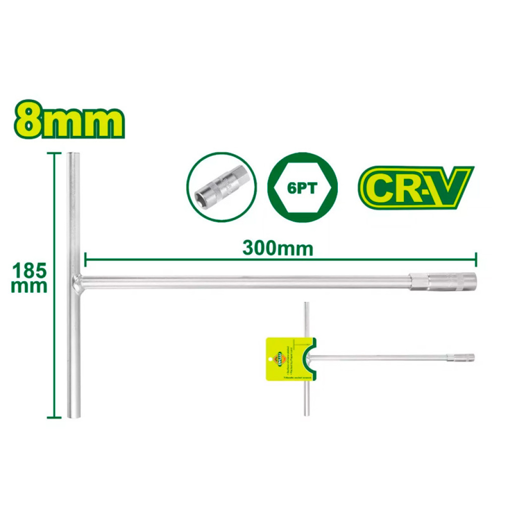 T-աձև բանալին պատրաստված է քրոմ-վանադիումային պողպատից։ Չափը՝ 8մմ։ Երկարությունը՝ 185x300մմ։