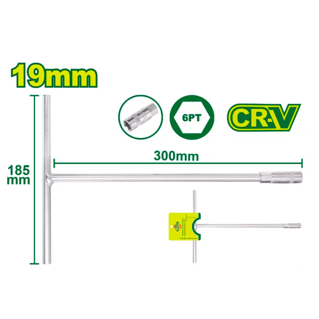 T-աձև բանալին պատրաստված է քրոմ-վանադիումային պողպատից։ Չափը՝ 19մմ։ Երկարությունը՝ 185x300մմ։
