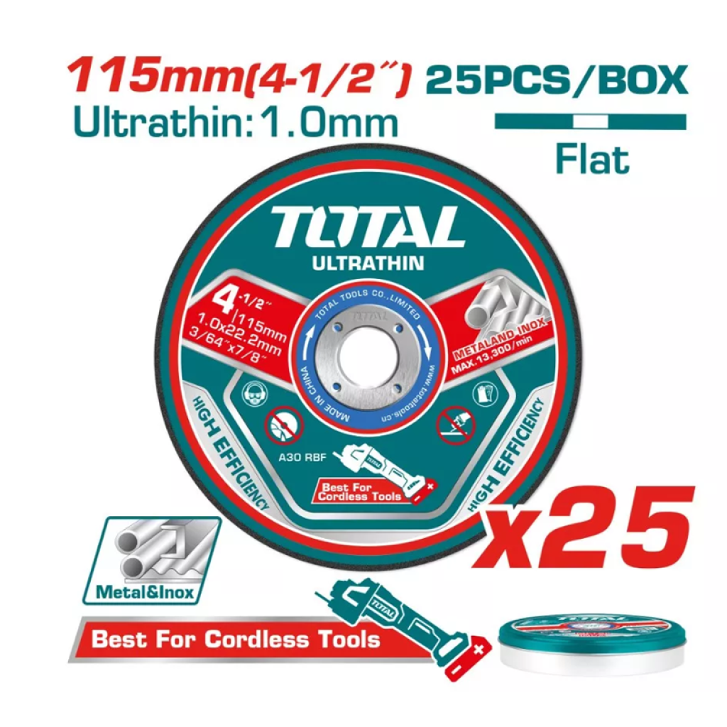 TOTAL TAC11011525 սկավառակները նախատեսված են մետաղների և INOX-ի կտրման աշխատանքների համար։ Փաթեթում առկա է 25 հատ սկավառակ։