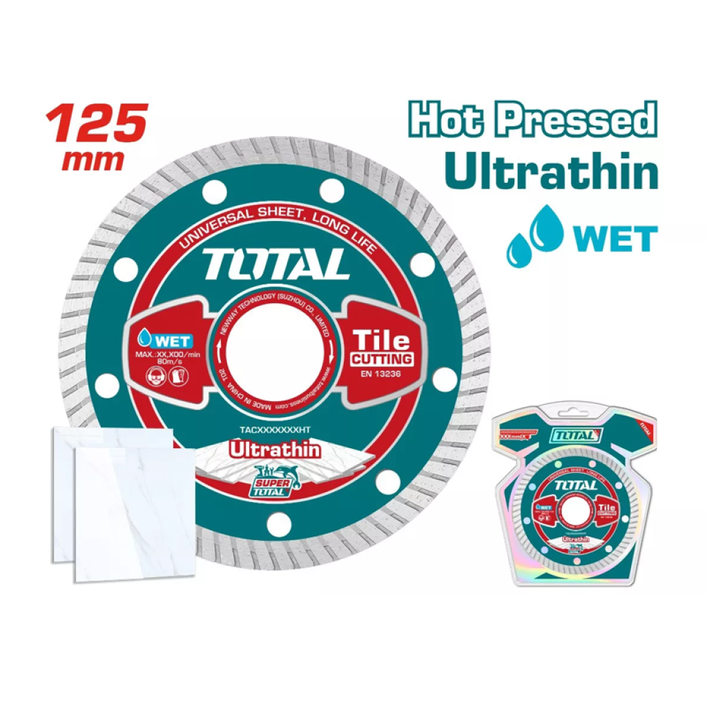 Ուլտրա բարակ TOTALTAC2131251HT ալմաստե սկավառակը պատրաստված է բարձրորակ խառնուրդից : Նախատեսված է բետոն , գրանիտ , մարմար , աղյուս , կերամիկական սալիկ և այլ կոշտ շինանյութեր կտրելու համար : Նվազեցված բերանի հաստությունը կրկնապատկում է կտրման արագությունը : Բարձր ամրության ադամանդի հատվածները` արդյունավետ հատման համար են :