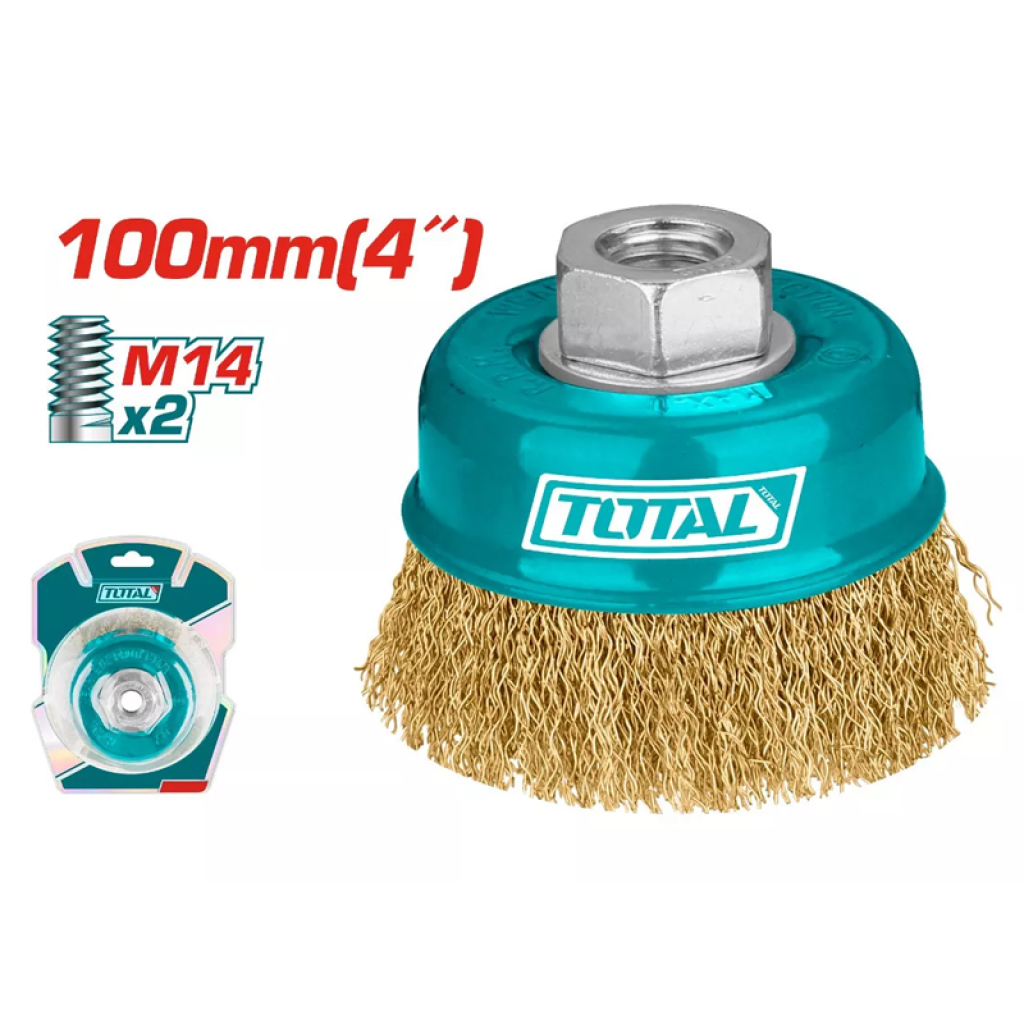 TOTAL TAC31041 - խոզանակը փոխարինող տարր է անկյունային հղկիչների համար : Այն օգտագործվում է լաքից , ներկից և ժանգից տարբեր մակերեսներ և ապրանքներ մաքրելու համար : Աշխատանքային մասը բաղկացած է արույրով ծածկված պողպատե մետաղալարից :