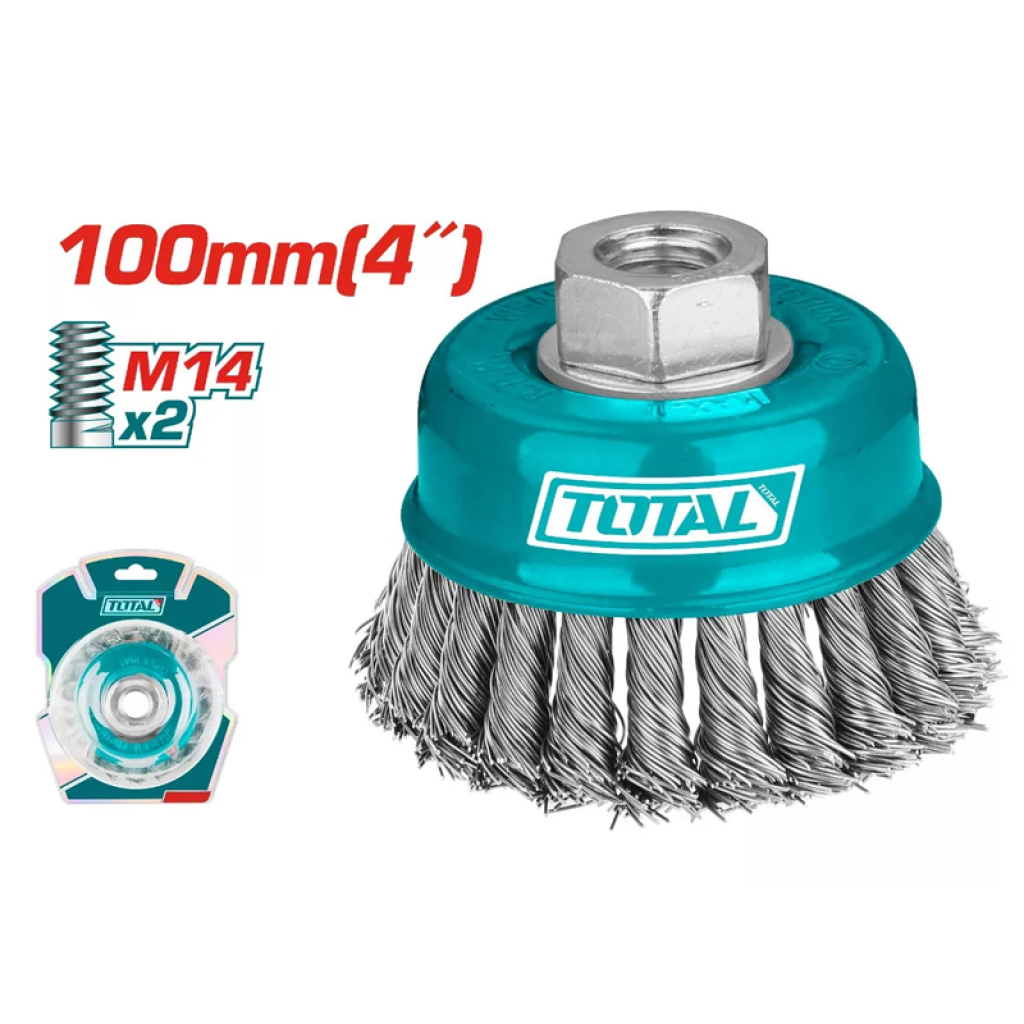 TOTAL TAC32041 - ը խոզանակը փոխարինող տարր է անկյունային հղկիչների համար : Այն օգտագործվում է լաքից , ներկից և ժանգից տարբեր մակերեսներ և ապրանքներ մաքրելու համար : Աշխատանքային մասը բաղկացած է արույրով ծածկված պողպատե մետաղալարից :