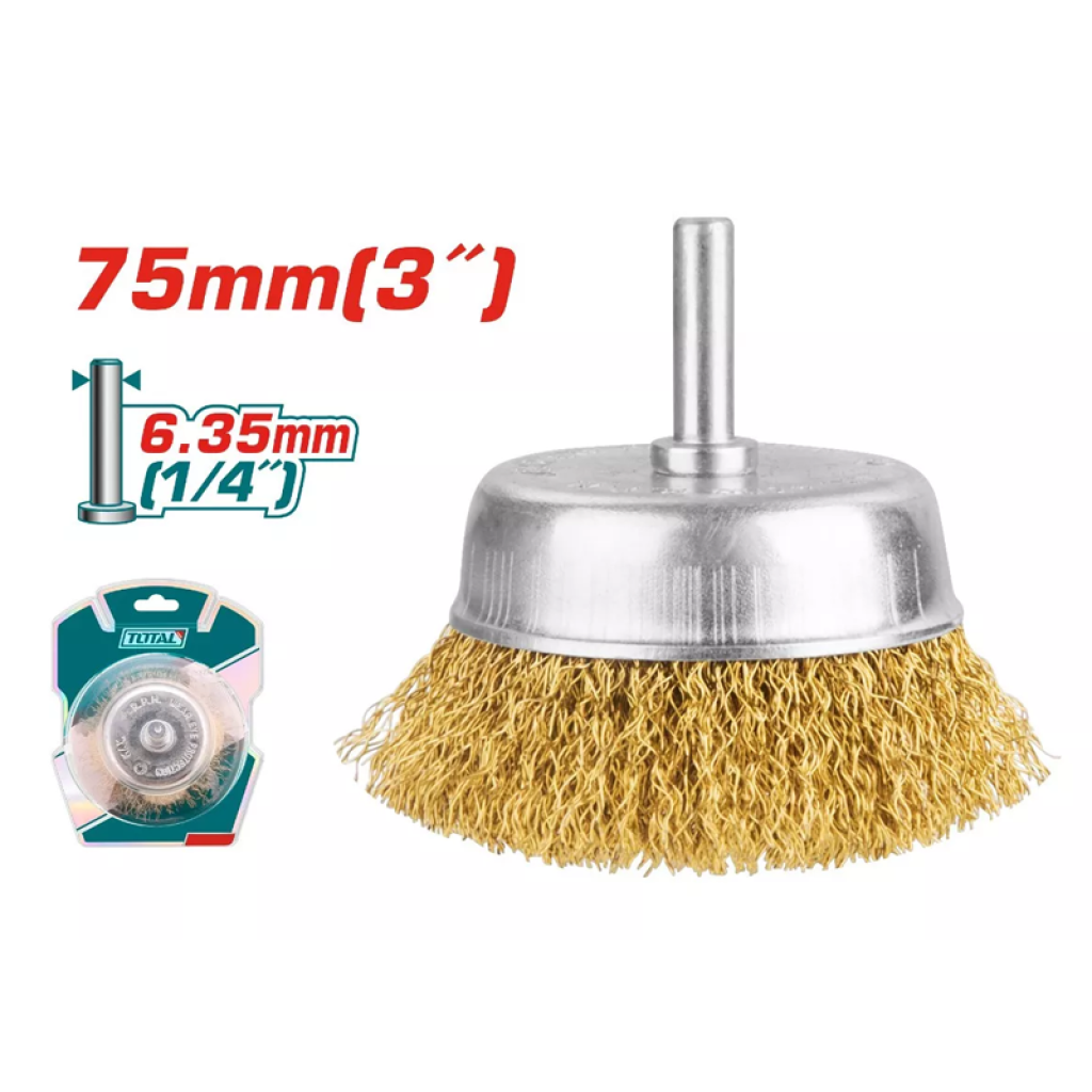 TOTAL TAC33031 - խոզանակը փոխարինող տարր է անկյունային հղկիչների համար : Այն օգտագործվում է լաքից , ներկից և ժանգից տարբեր մակերեսներ և ապրանքներ մաքրելու համար : Աշխատանքային մասը բաղկացած է արույրով ծածկված պողպատե մետաղալարից :