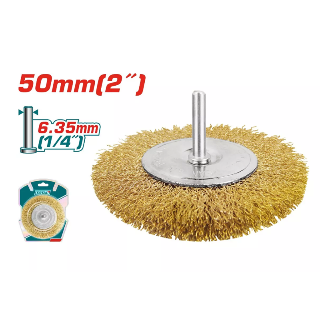 TOTAL TAC34021 - խոզանակը փոխարինող տարր է անկյունային հղկիչների համար : Այն օգտագործվում է լաքից , ներկից և ժանգից տարբեր մակերեսներ և ապրանքներ մաքրելու համար : Աշխատանքային մասը բաղկացած է ծալքավոր ցինկապատ պողպատե մետաղալարից :
