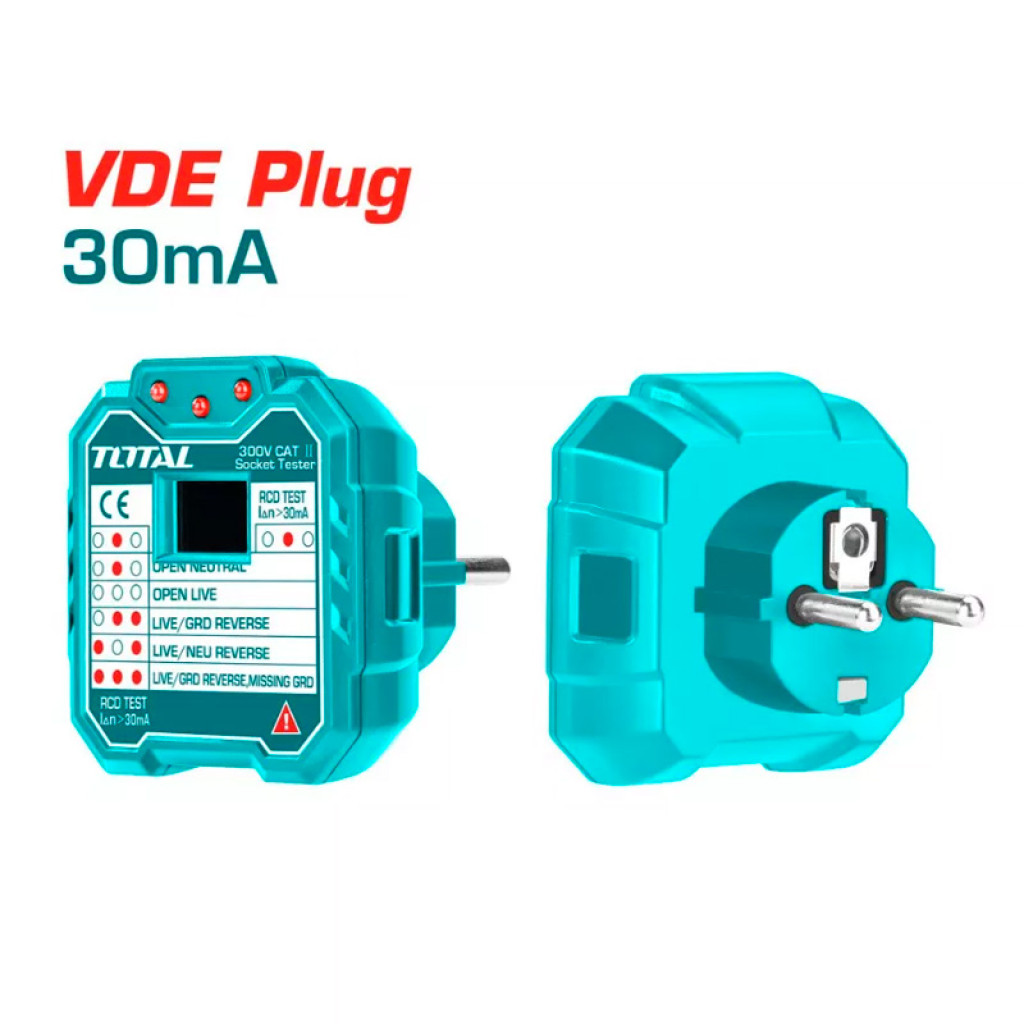 TOTAL TESST30002 սարքը նախատեսված է էլեկտրական վարդակների միացումը ստուգելու և հնարավոր խափանումները հայտնաբերելու համար: Այն ունի լուսարձակող ցուցիչներ, որոնք ցույց են տալիս միացման յոթ հնարավոր վիճակ, այդ թվում՝ ճիշտ միացում, հողանցման, չեզոք գծի կամ ֆազի բացակայություն: Տեստերը հագեցած է LCD էկրանով, որը ցուցադրում է փոխադարձ լարման արժեքը ցանցում: Աշխատանքի առավելագույն լարում կազմում է 300 Վ, իսկ UZO-ի փորձարկումը իրականացվում է 30 մԱ-ից ավելի հոսանքի ժամանակ: