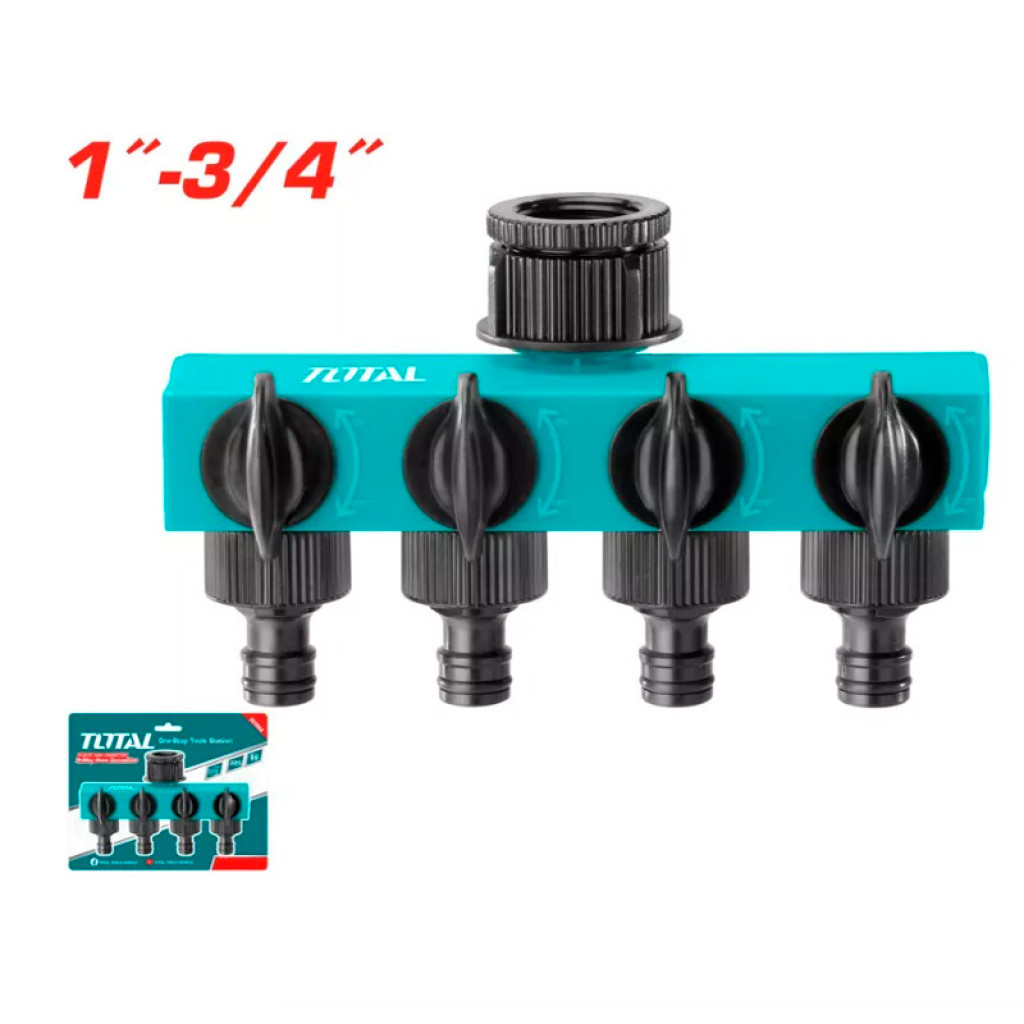 TOTAL THHC604101 խողովակի միացուցիչը պատրաստված է դիմացկուն ABS և PP պլաստիկից՝ պտտվող գայկայով և փականով: 4-ալիքային կառուցվածքը ապահովում է ջրի արդյունավետ բաշխում և հուսալի կապ խողովակների հետ: