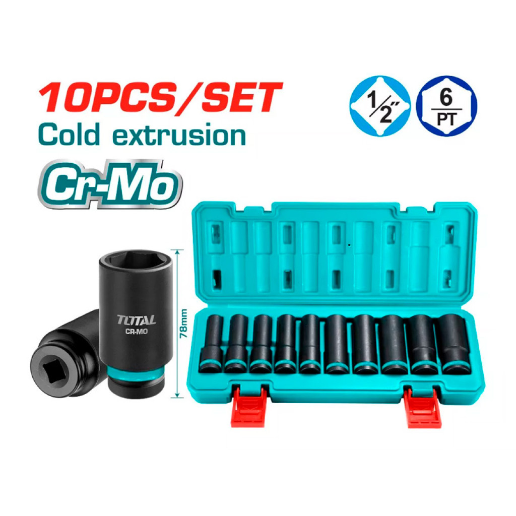 TOTAL THKISD12102L - հարվածային գլխիկների հավաքածուն օգտագործվում է բանալիներով ամրացումներ տեղադրելու / ապամոնտաժելու համար : Ապրանքներն ունեն վեցանկյուն աշխատանքային պրոֆիլ : Հավաքածուն մատակարարվում է պլաստմասե պահոցում և բաղկացած է 10 գլխիկներից երկարությամբ ՝ 38 մմ , 10 մմ, 12 մմ, 13 մմ, 14 մմ, 15 մմ, 17 մմ, 19 մմ, 21 մմ, 22 մմ, 24 մմ: