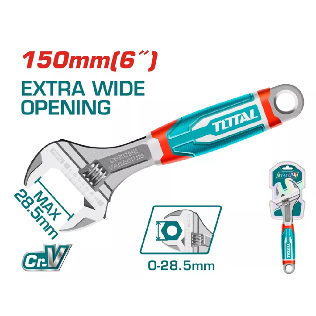 150 մմ TOTAL THT101106 - կարգավորվող բանալին նախատեսված է տարբեր տրամագծերի , ամրացումների հավաքման և ապամոնտաժման համար : Քրոմ վանադիումի պողպատը , որից պատրաստվում է արտադրանքի աշխատանքային մասը , նրան ապահովում է զգալի բեռներին դիմակայելու և երկար սպասարկման ունակություն : Ռետինե սեղմիչը ունի հարմարավետ ձև և չի սահում ձեռքում : Գործիքը մատակարարվում է պլաստմասե կախիչի հետ ՝ հեշտ պահելու համար :