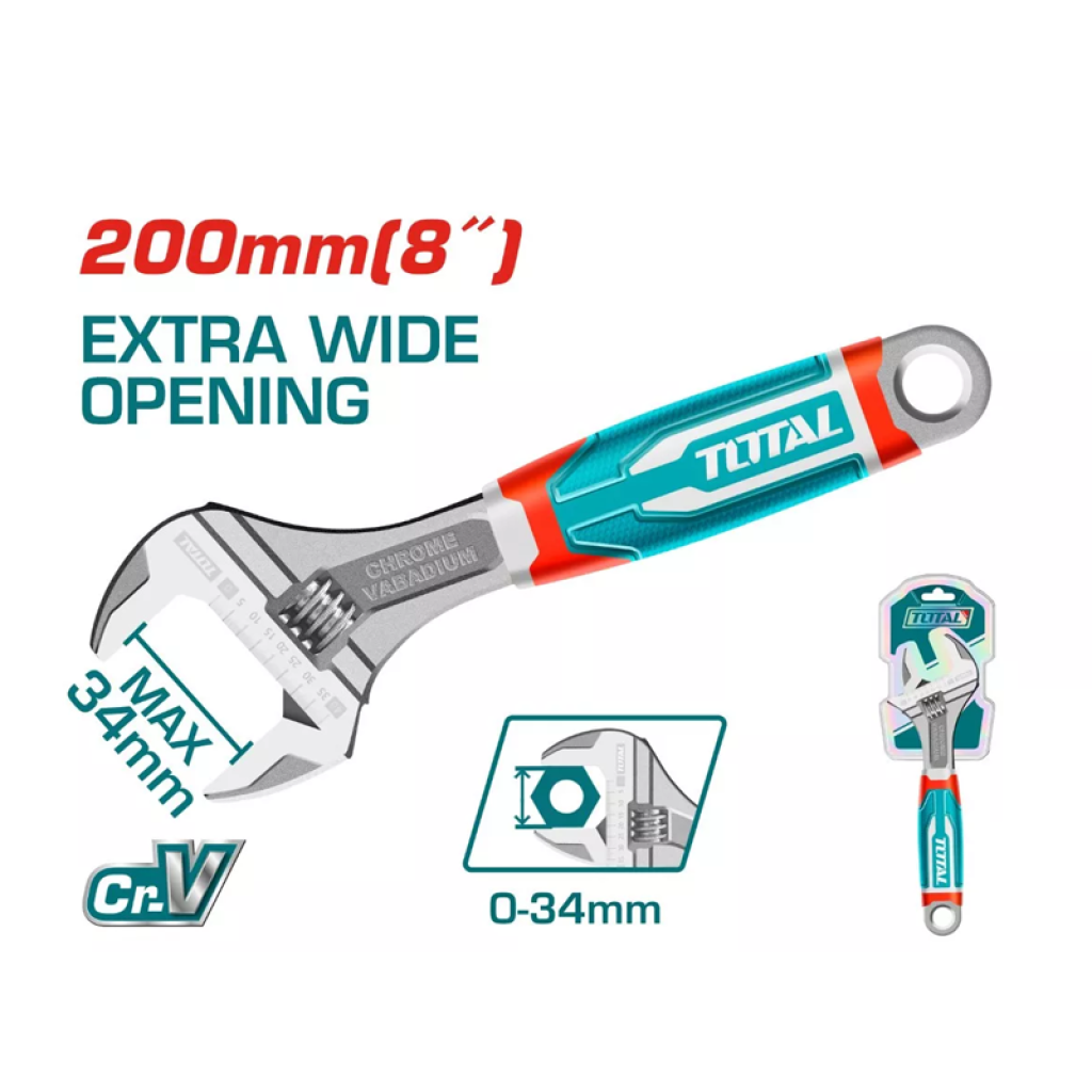 200 մմ TOTAL THT101106 - կարգավորվող բանալին նախատեսված է տարբեր տրամագծերի ամրացումների հավաքման և ապամոնտաժման համար : Քրոմ վանադիումի պողպատը , որից պատրաստվում է արտադրանքի աշխատանքային մասը , նրան ապահովում է զգալի բեռներին դիմակայելու և երկար սպասարկման ունակություն : Ռետինե սեղմիչը ունի հարմարավետ ձև և չի սահում ձեռքում : Գործիքը մատակարարվում է պլաստմասե կախիչի հետ ՝ հեշտ պահելու համար :