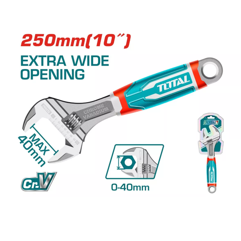 250 մմ TOTAL THT101106 - կարգավորվող բանալին նախատեսված է տարբեր տրամագծերի ամրացումների հավաքման և ապամոնտաժման համար : Քրոմ վանադիումի պողպատը , որից պատրաստվում է արտադրանքի աշխատանքային մասը , նրան ապահովում է զգալի բեռներին դիմակայելու և երկար սպասարկման ունակություն : Ռետինե սեղմիչը ունի հարմարավետ ձև և չի սահում ձեռքում : Գործիքը մատակարարվում է պլաստմասե կախիչի հետ ՝ հեշտ պահելու համար :