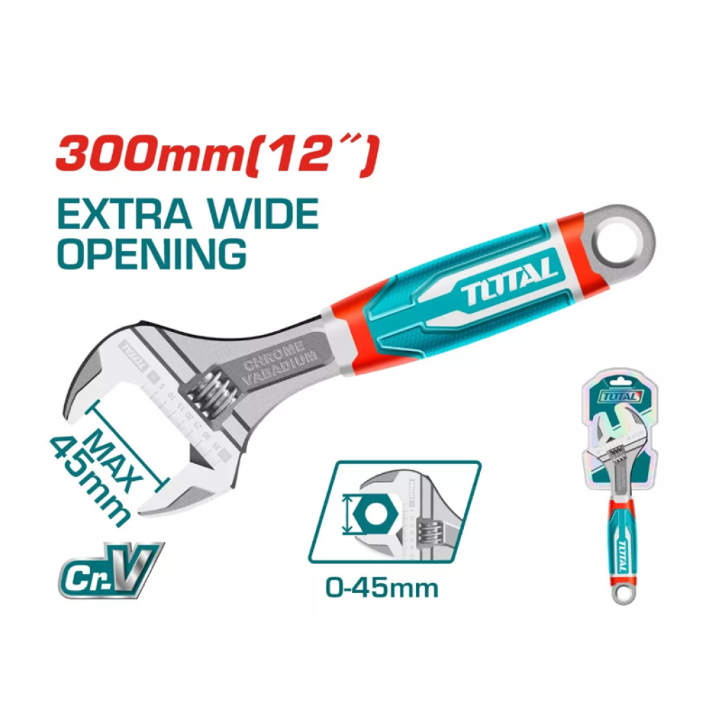 300 մմ TOTAL THT101126 - կարգավորվող բանալին նախատեսված է տարբեր տրամագծերի ամրացումների հավաքման և ապամոնտաժման համար : Քրոմ վանադիումի պողպատը , որից պատրաստվում է արտադրանքի աշխատանքային մասը , նրան ապահովում է զգալի բեռներին դիմակայելու և երկար սպասարկման ունակություն : Ռետինե սեղմիչը ունի հարմարավետ ձև և չի սահում ձեռքում : Գործիքը մատակարարվում է պլաստմասե կախիչի հետ ՝ հեշտ պահելու համար :