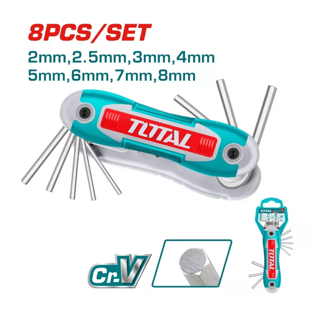 Վեցանկյուն բանալիների ծալովի հավաքածու 8 հատ TOTAL THT1061826- ը վեցանկյուն միացումներն ամրացնելու և ապամոնտաժելու գործիքների կոմպակտ հավաքածու է : Բանալիները պատրաստված են քրոմ վանադիումի պողպատից , ունեն բարձր ամրություն և երկար ծառայության ժամկետ : Ծալովի դիզայնը՝ կոկիկ պահեստավորման համար։