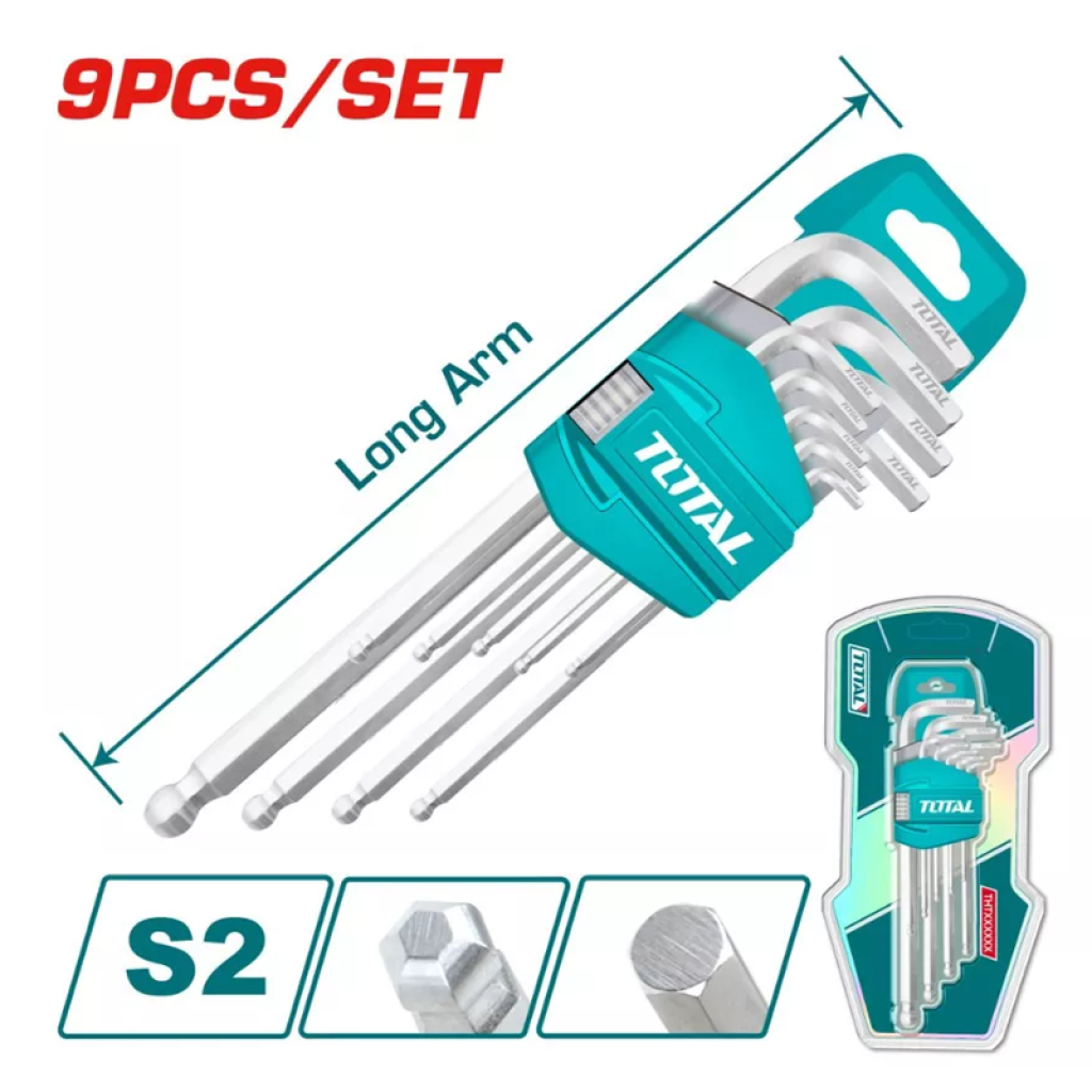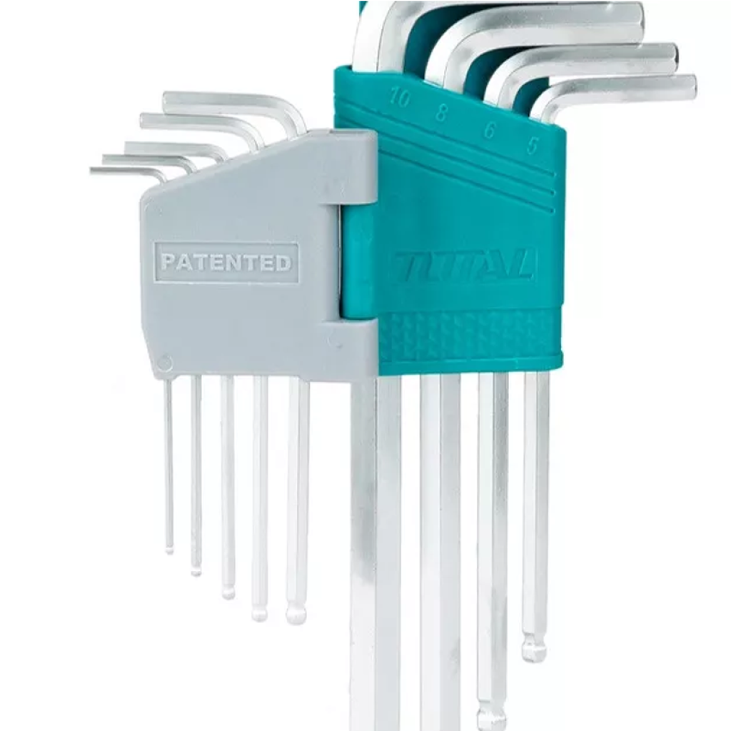 Գնդիկավոր վեցանկյուն բանալիների հավաքածու 9 հատ TOTAL THT106291- ը ձեռքի գործիքների հավաքածու է ՝ մխոցավոր պտուտակների տեղադրման կամ ապամոնտաժման համար : Հավաքածուն օգտակար կլինի ավտոտնակում, ավտոտեխսպասարկման կետում կամ տանը : Պլաստմասե կրիչը ապահովում է կոմպակտ պահպանում և բանալիների հեշտ տեղափոխում :