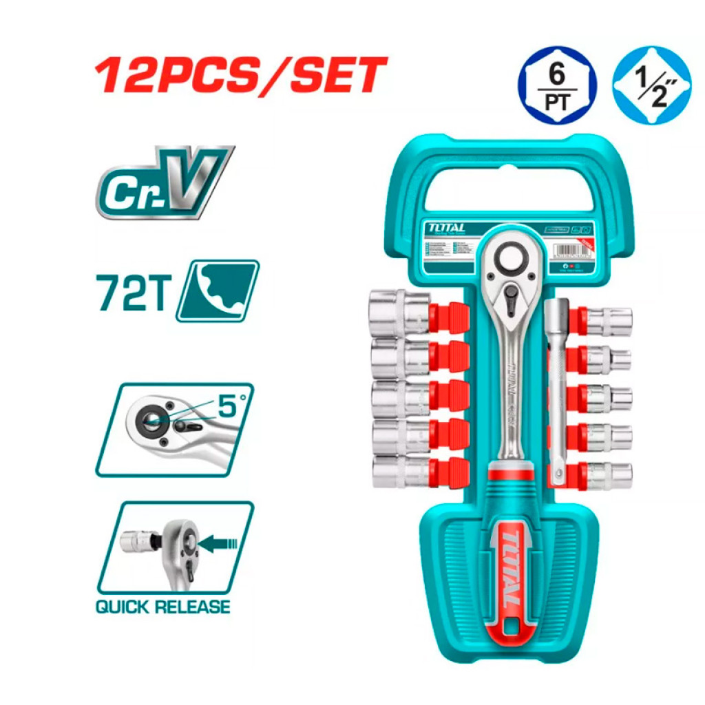 TOTAL THT141121 - հավաքածու ՝ պարուրաձեւ միացումներով մոնտաժման , ապամոնտաժման , վերանորոգման աշխատանքների գործիքների ամբողջություն : Տեղադրման չափը ` 1/2" : Շարժողական մեխանիզմով բռնիչը հագեցած է հատուկ կոճակով , որի շնորհիվ գլխիկների փոփոխությունն ավելի արագ է կատարվում : Աշխատանքային մասերը պատրաստված են քրոմապատ քրոմ - վանադիումային պողպատից , որն ապահովվում է գործիքին ամրություն և երկար սպասարկում : Բռնակը բռնելու համար հարմար է և չի սահում : Կախիչը թույլ է տալիս գործիքը կոկիկ պահել :