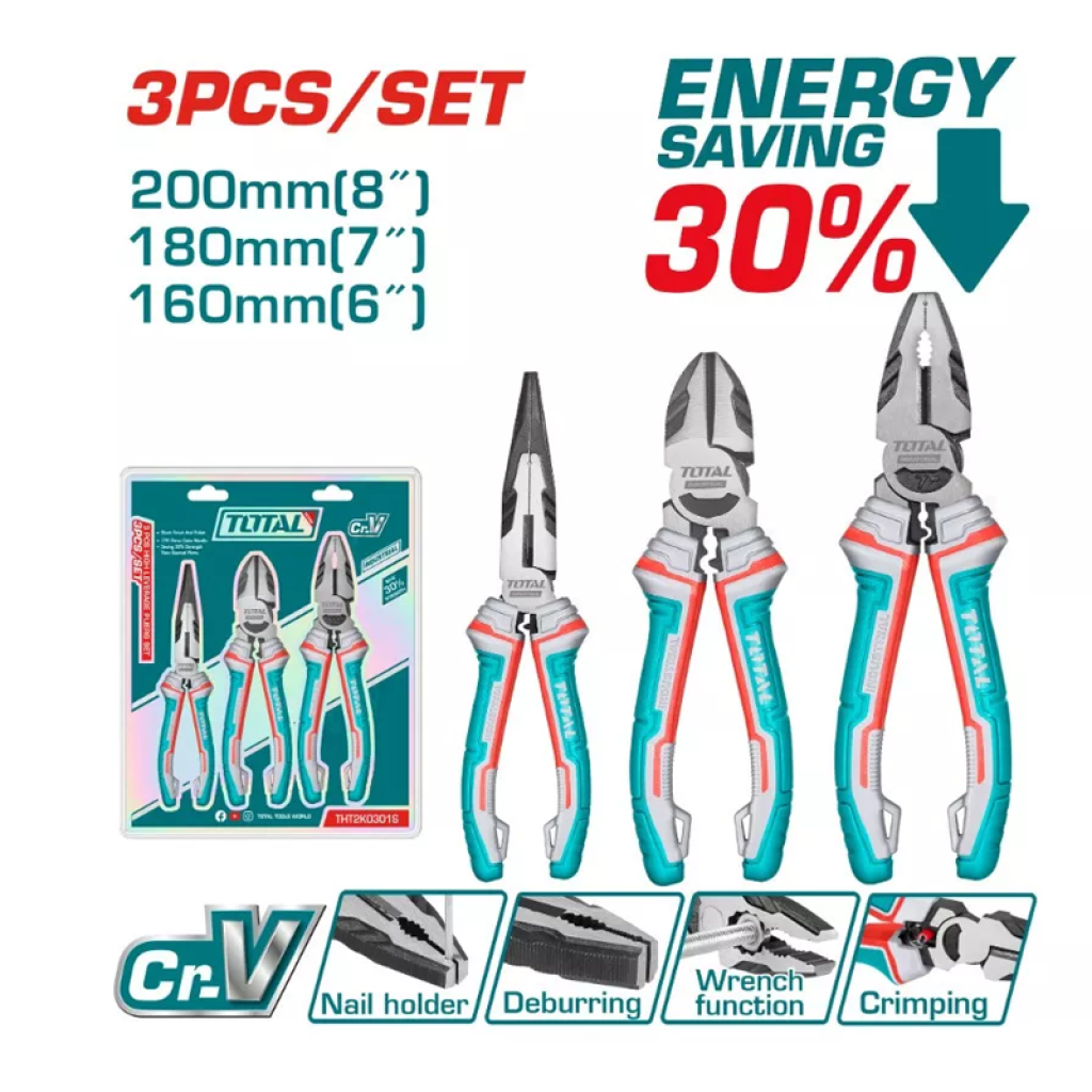 TOTAL THT2K0301- ը հարմար է վերանորոգման և տեղադրման աշխատանքների լայն շրջանակի համար : Գործիքների աշխատանքային մասերը պատրաստված են բարձր ամրության և կոռոզիայից դիմացկուն քրոմ վանադիումի պողպատից , ունեն օքսիդացված և փայլեցված ծածկույթ : Բռնակները պատրաստված են ջերմապլաստիկ կաուչուկից , ունեն էրգոնոմիկ ձև ՝ հարմարավետ օգտագործման համար :