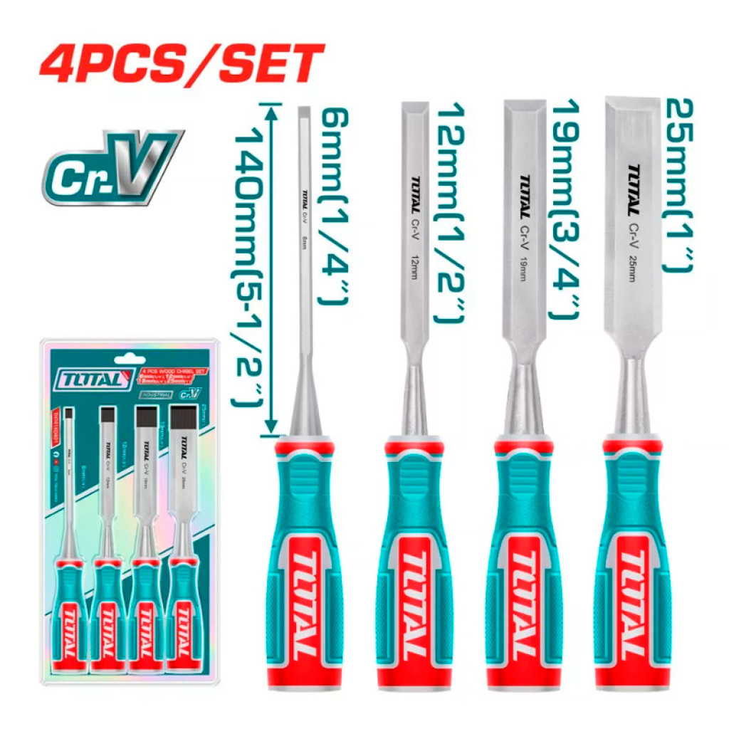 Փայտե սայրերի (դուր) հավաքածու 4 հատ : TOTAL THT41K0401 - Ձեռքի ատաղձագործական գործիքների ամենատարածված չափերի շարք : Սայրի աշխատանքային մասը պատրաստված է քրոմ-վանադիումային պողպատից և ունի բարձր դիմացկունություն : Էրգոնոմիկ բռնակները ապահովում են արտադրանքի անվտանգ ֆիքսումը ձեռքում և չեն սայթաքում :