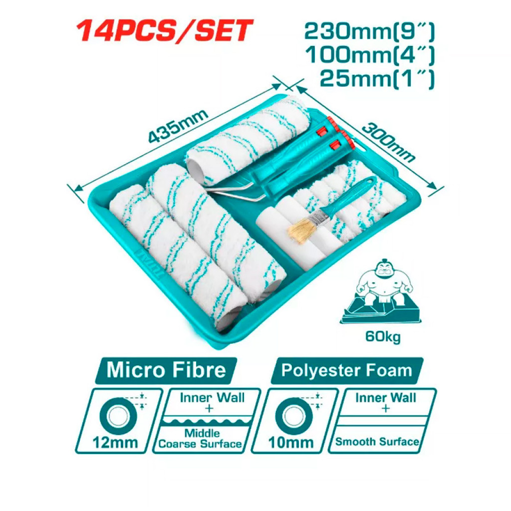 Փաթեթում | Գլանափաթեթներ ՝ 3 հատ - 230 մմ ( 9 ") 12 մմ : Գլանափաթեթներ ՝ 5 հատ - 100 մմ ( 4 ") 12 մմ : Պոլիեսթեր գլան ՝ 2 հատ - 100 մմ ( 4 ") : Գլան ՝ 1 հատ - 230 մմ ( 9 ") : Գլան ՝ 1 հատ - 100 մմ ( 4 ") : Վրձին ՝ 1 հատ - 25 մմ ( 1 ") : Սկուտեղի չափը ` 435 x 300 մմ |