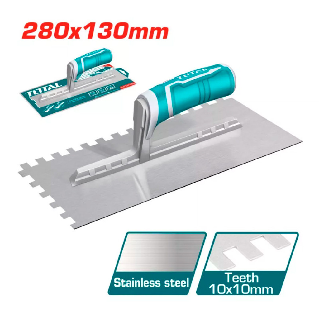 TOTAL THTT81286 - ը նիկելի բարձր պարունակությամբ գործիք է : Սանրը նախատեսված է հարդարման աշխատանքների ընթացքում սոսինձի լուծույթը մակերեսին հավասարապես կիրառելու և տարածելու համար : Չժանգոտվող պողպատից սայրը հագեցած է 10 x 10 մմ ատամներով : Երկու կտոր բռնիչը ապահովում է անվտանգ բռնումը :